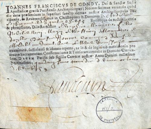 Document (Exeat par Dominique Séguier, évêque de Meaux (Melden) à Séraphin Marganne, fils de Sébastien Marganne et de Denise Jounet, de recevoir la confirmation et la tonsure et des bénéfices écclésiastiques dans le diocèse de Paris)
