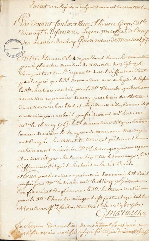 Document (Sentence rendue dans la cause de Étienne Blot vs Regnault Duval, en appel d'un jugement de la Chambre de milice, concernant la destruction de clôtures lors de l'occupation d'une terre par les troupes de Murray)