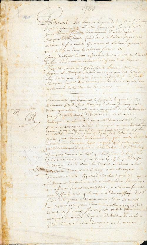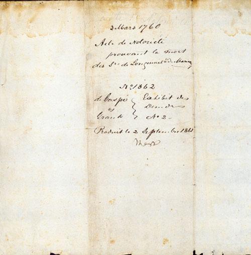 Document (Déclaration notariée par Pierre Rigaud de Vaudreuil et M. de Noyan de la mort à St-Domingue du baron de Longueuil fils et du Sieur de Maricourt)