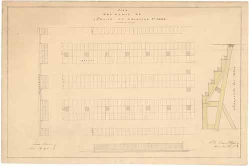 1- Plan des bancs de l'église de Saint-Jean-Baptiste 2- Coupe des charpentes des galeries 3- Coupe transversale montrant la situation des bancs.