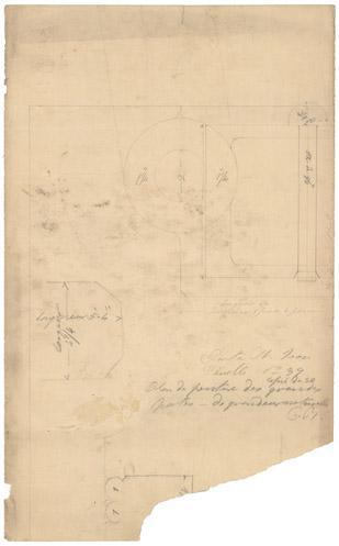 Droite, bas: Largeur 4 1/4; Longueur 5 pieds 4 pouces; Porte St. Jean; Feuille No 39; Copie de 30; Plan de penture des grandes; Portes - de grandeur naturelle; C. B.