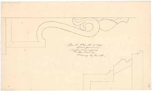 Chambranle des portes des principaux appartements de l'Université Laval. Au recto: 1- Élévation 2- Coupe de la console de support. Au verso: 1- Profil du motif décoratif de la console 2- Profil du linteau.