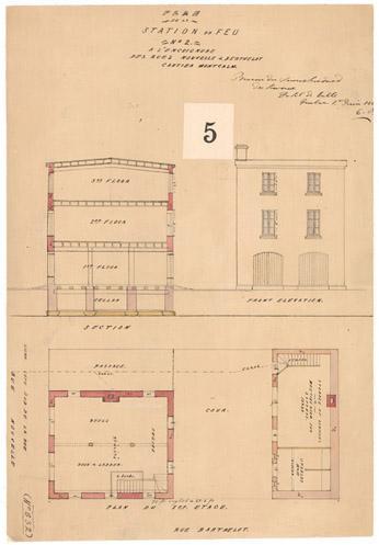 Gauche à droite, de haut en bas: Plan; De la; Station du feu; No 2; À l'encoignure; Des rues Nouvelle & Berthelot; Cartier Montcalm.; Bureau du surintendand; Des travaux; Hotel de Ville; Quebec 1er juin 186-; C. B.; 5; 3rd floor; 2nd floor; 1st. floor; Cellar, Front elevation.; Section; Stairs.; Passage; Dr.; Canal.; F. dr.; Cour.; Dr., Reels, W.; W.; Dr., Hook & ladder, Dr., Dr.; 2 banks; W.; W., W., Dr.; 70 ft. english = 65.8 fr.; Plan du 1er étage.; Rue Berthelot
