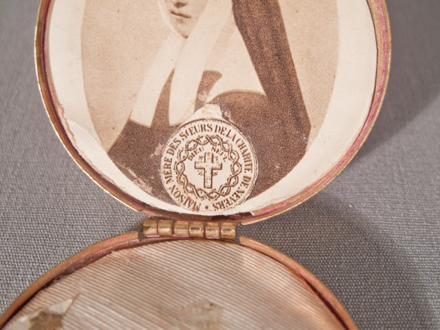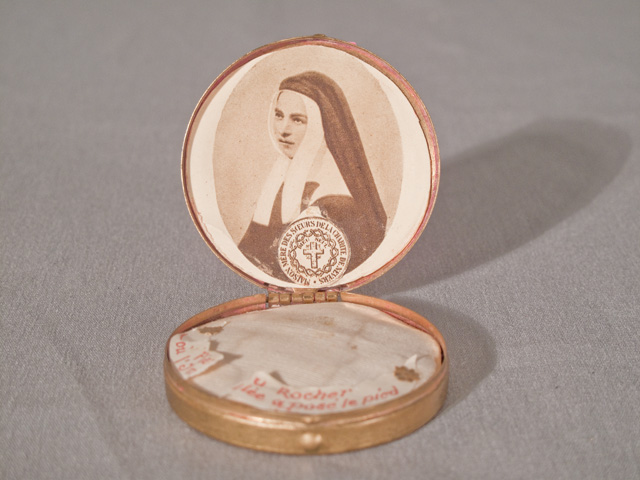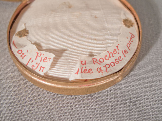 Sous le couvercle du dessus : MAISON MERE DES SOEURS DE LA CHARITE DE SEVERS / DIEU SETZ; à l'intérieur du reliquaire : Pier[...]u Rocher / où I'In[...]lée a posé le pied