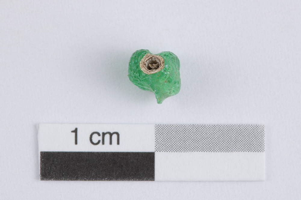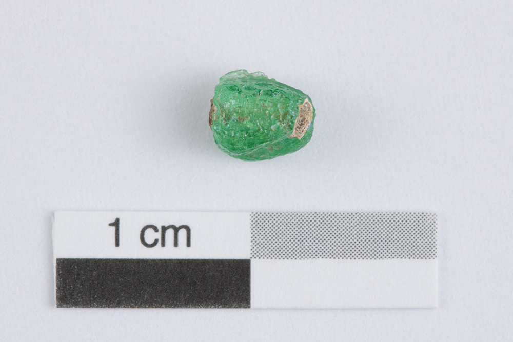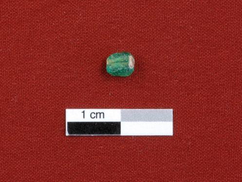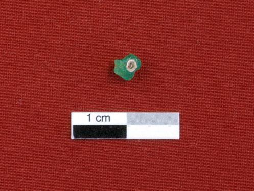 La perle, servant aux échanges avec les populations autochtones et à la parure des Européens (bijoux, chapelets, habillement), est fabriquée entre le XVIe et le XIXe siècle. Elle est faite d'une couche de verre de couleur verte transparente. Elle est de forme « étoile » et mesure 5,5 mm de longueur sur 4,5 mm de largeur. Une tige de métal semble présente dans le trou de la perle.