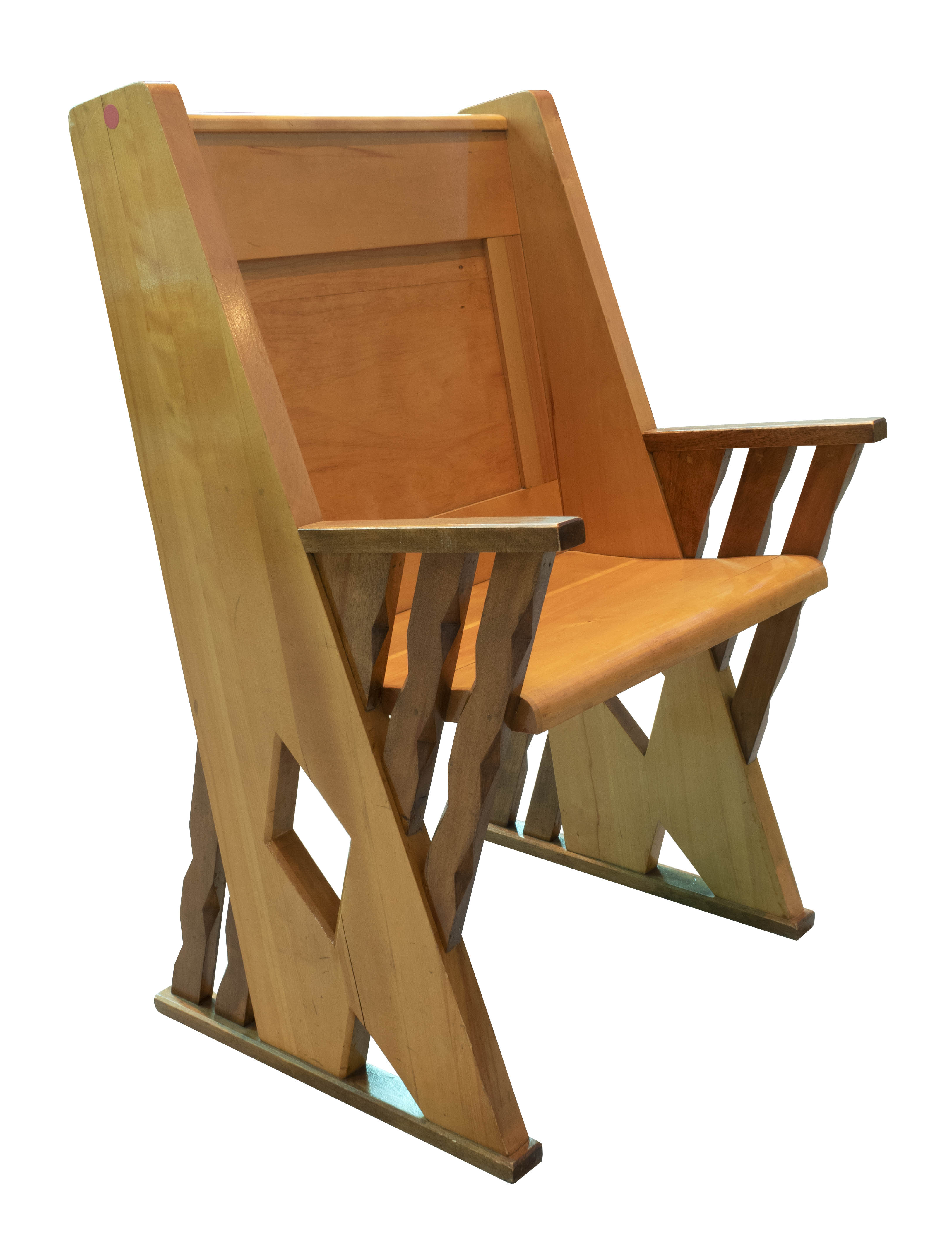 Fauteuil en bois verni aux montants triangulaires percés d'ajours en forme de losange dans le bas. Les accotoirs sont composés de trois barreaux en bois teint brun foncé taillés en zigzag. Ils croisent les montants et deux barreaux, ayant subi le même traitement, font un rappel dans le bas.