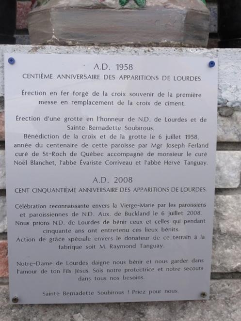 Érection d'une grotte en l'honneur de N. D. de Lourdes et de Sainte Bernadette Soubirous. Bénédiction de la croix et de la grotte le 6 juillet 1958, année du centenaire de cette paroisse par Mgr Joseph Ferland curé de St-Roch de Québec accompagné de monsieur le curé Noël Blanchet, l'abbé Évariste Corriveau et l'abbé Hervé Tanguay.