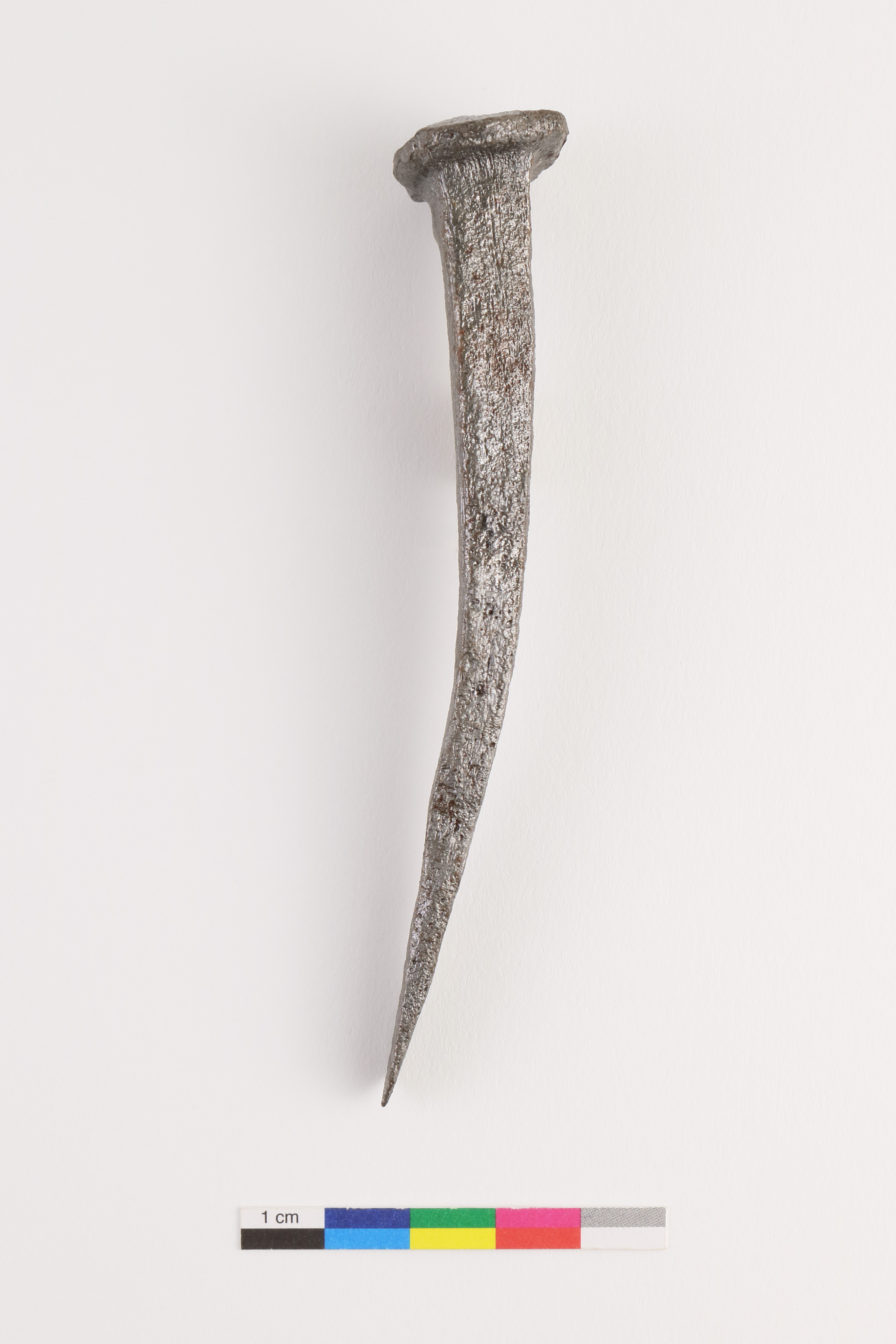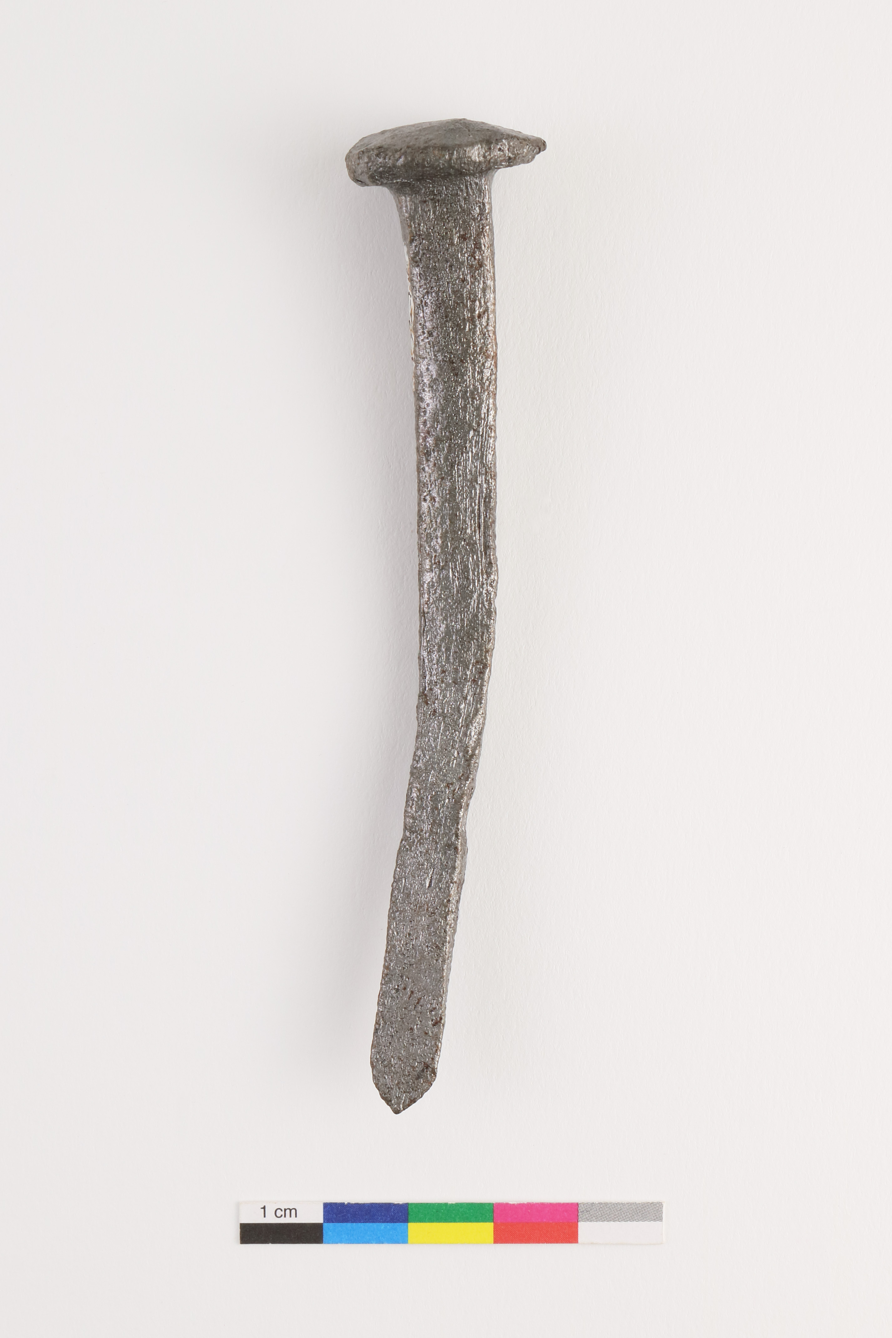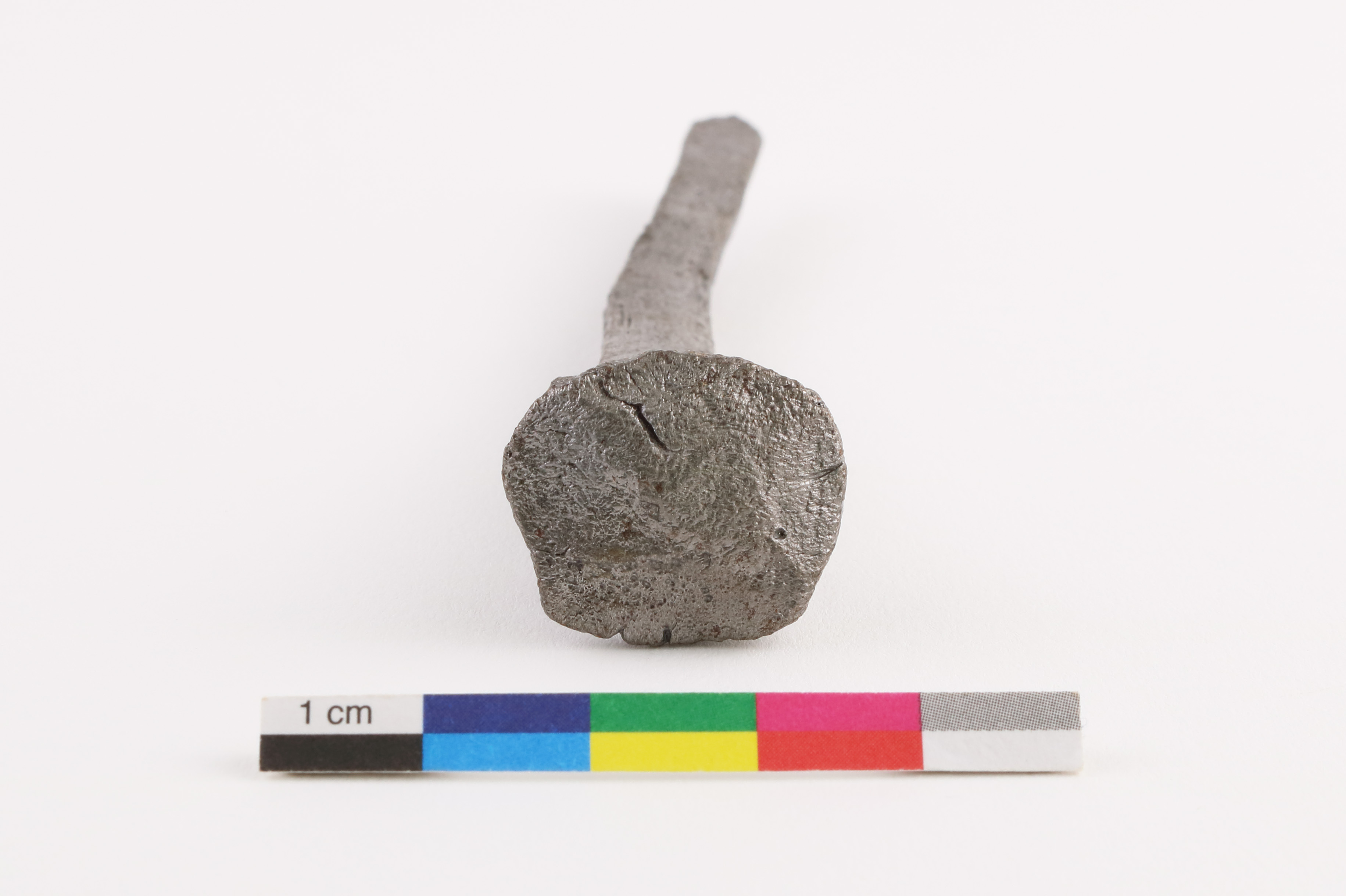 Le clou forgé est un élément de fixation. Entier, l'objet en fer est doté d'une tête circulaire concave et d'une tige de section carrée terminée en pointe. Le clou mesure 11,4 cm de longueur et 1,1 cm de diamètre maximal au niveau de la tête.