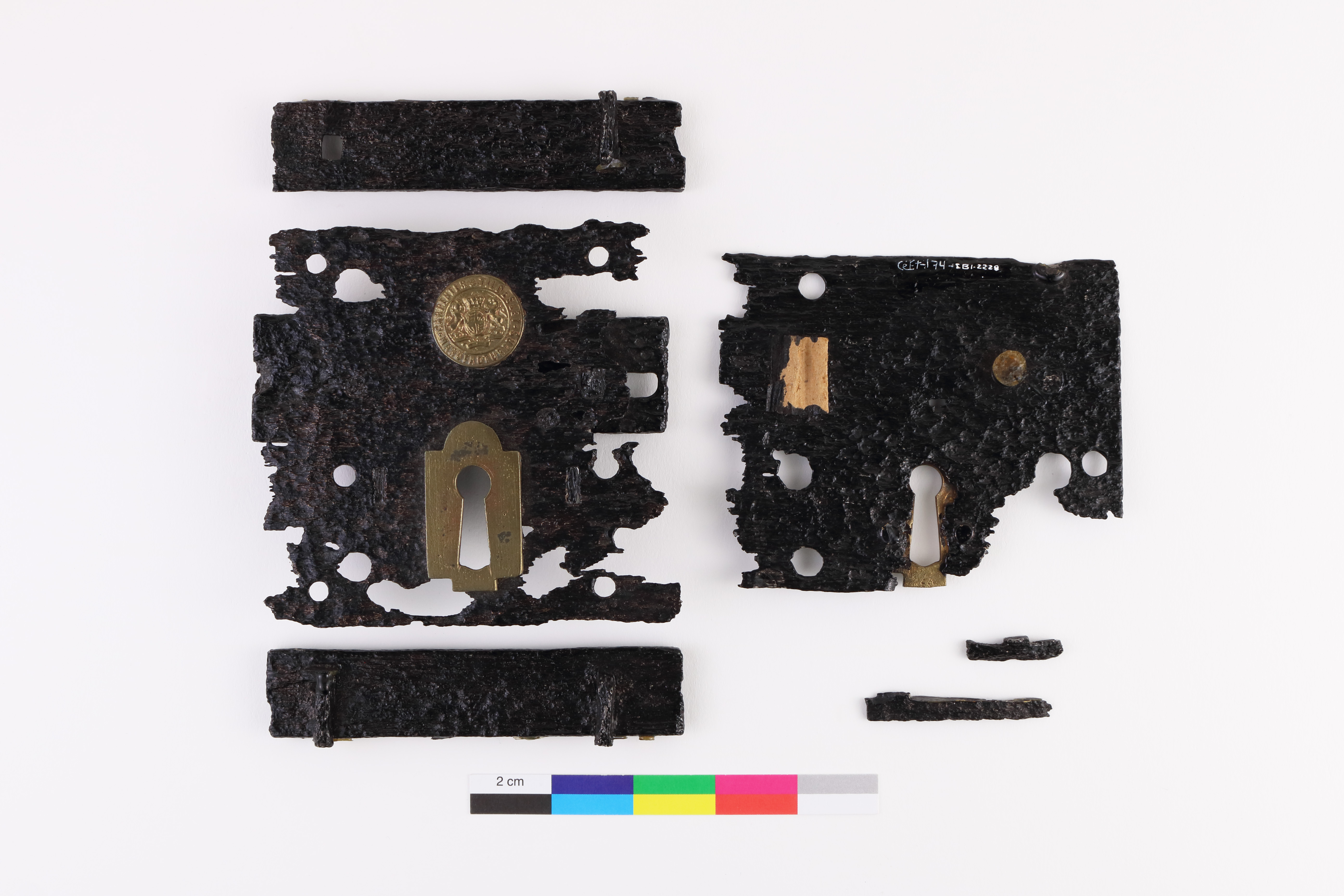 La serrure à cloison métallique fait partie d'un dispositif de verrouillage datant d'entre la moitié du XIXe siècle et de la fin du XXe siècle. Complet, l'objet en fer et laiton est composé de six fragments et constitue un boîtier métallique. La plaque principale, ou palastre, est de forme carrée et est percée d'un trou de serrure. L'entrée de serrure en laiton est ornementale et est équipée d'un pêne à demi-tour. Le palastre est percé de 15 trous de fixation. Un médaillon circulaire de laiton doré portant l'inscription « Carpenter and Tildesley Manufacturers » avec le blason britannique est incrusté au revers du boîtier. L'objet mesure 9,5 cm de hauteur, 10 cm de longueur et 1,8 cm d'épaisseur.