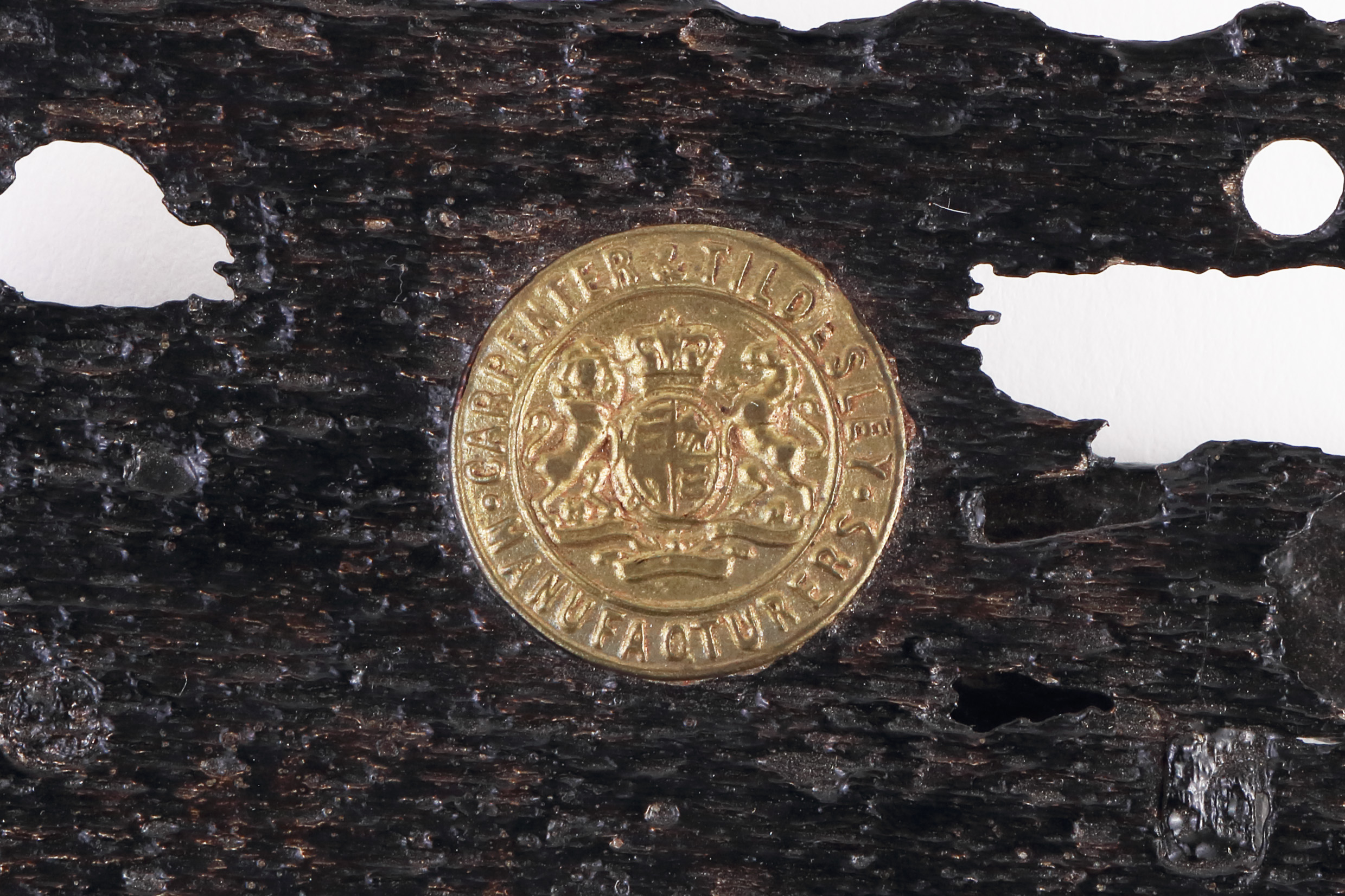 Moulée en relief sur l'écusson décoratif : CARPENTER AND TILDESLEY / (représentation des armoiries de l'Angleterre) / MANUFACTURERS