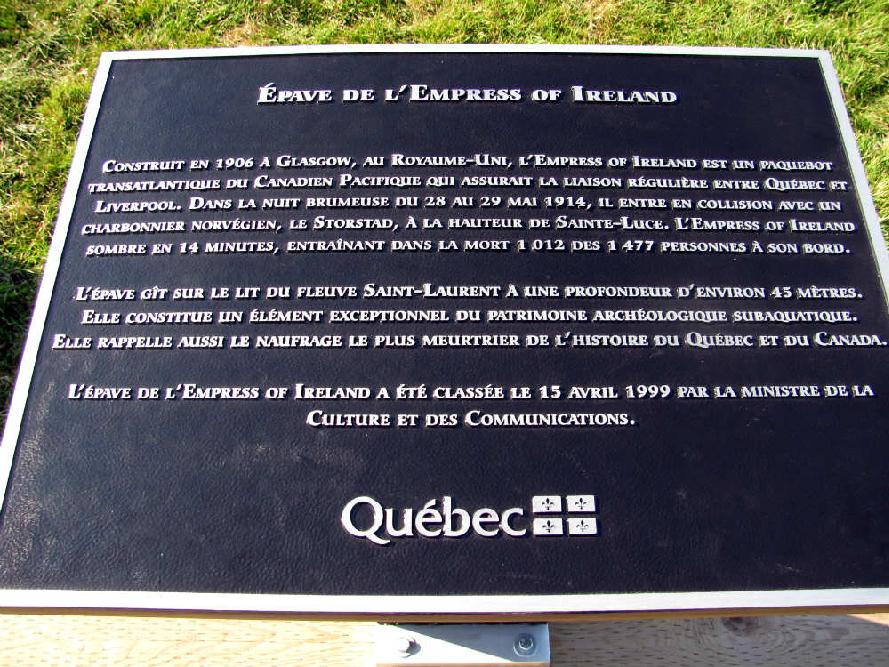 Construit en 1906 à Glasgow, au Royaume-Uni, l'Empress of Ireland est un paquebot transatlantique du Canadien Pacifique qui assurait la liaison régulière entre Québec et Liverpool. Dans la nuit brumeuse du 28 au 29 mai 1914, il entre en collision avec un charbonnier norvégien, le Storstad, à la hauteur de Sainte-Luce. L'Empress of Ireland sombre en 14 minutes, entraînant dans la mort 1 012 des 1 477 personnes à son bord.