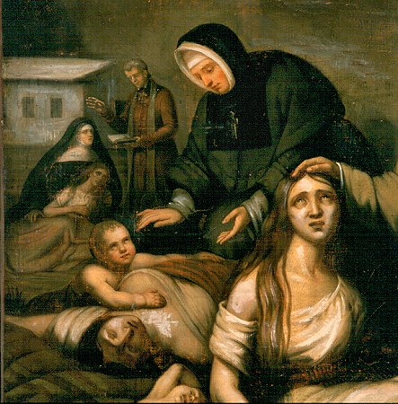 Cette toile réalisée vers 1849 mesure 257 cm de hauteur et 183 cm de largeur. L'oeuvre représente une scène se déroulant vraisemblablement à la pointe Saint-Charles, à Montréal, pendant l'épidémie de typhus de 1847. Une apparition de la Vierge se trouve dans la partie supérieure gauche. Cette dernière est placée dans un ciel sombre parmi les nuages. Au premier plan, une soeur Grise se tient debout, vêtue d'une robe, d'une pèlerine, de manchons et d'une coiffe. Un crucifix est attaché à son cou et sa main droite est posée sur la tête d'une femme malade assise au sol. Une couverture est posée sur les jambes de cette dernière qui regarde vers le ciel d'un air fiévreux. Son visage creux ainsi que ses membres maigres sont d'une teinte grisâtre. Elle est vêtue d'une robe blanche et ses longs cheveux châtains couvrent une partie de son épaule droite dénudée. Un bambin couché au sol se trouve à gauche des deux femmes tandis que deux hommes se trouvent à droite. L'un, probablement sans vie, est posé sur les genoux du second qui regarde vers le ciel d'un air triste. Au second plan, une soeur de la Providence semble bénir une femme sans vie ainsi qu'un bambin serrant le sein de cette dernière. À l'arrière-plan, un prêtre vêtu d'une soutane mauve tient un livre et lève la main en direction d'une femme malade, aux bras d'une soeur hospitalière de Saint-Joseph.
