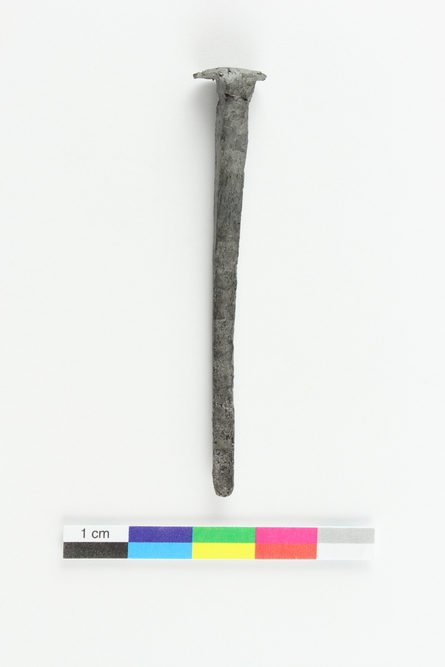 Ce clou en fer forgé date du début du XVIIIe siècle. Il ne semble pas avoir été utilisé, puisque sa tige est droite. Ce clou correspond au type 1.1.3 de Legendre.