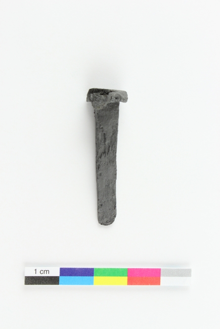 Ce clou en fer forgé date du début du XVIIIe siècle. La tige de ce clou est légèrement courbée, ce qui pourrait indiquer qu'il a été utilisé. Ce clou correspond au type 2.1.1 de Legendre.