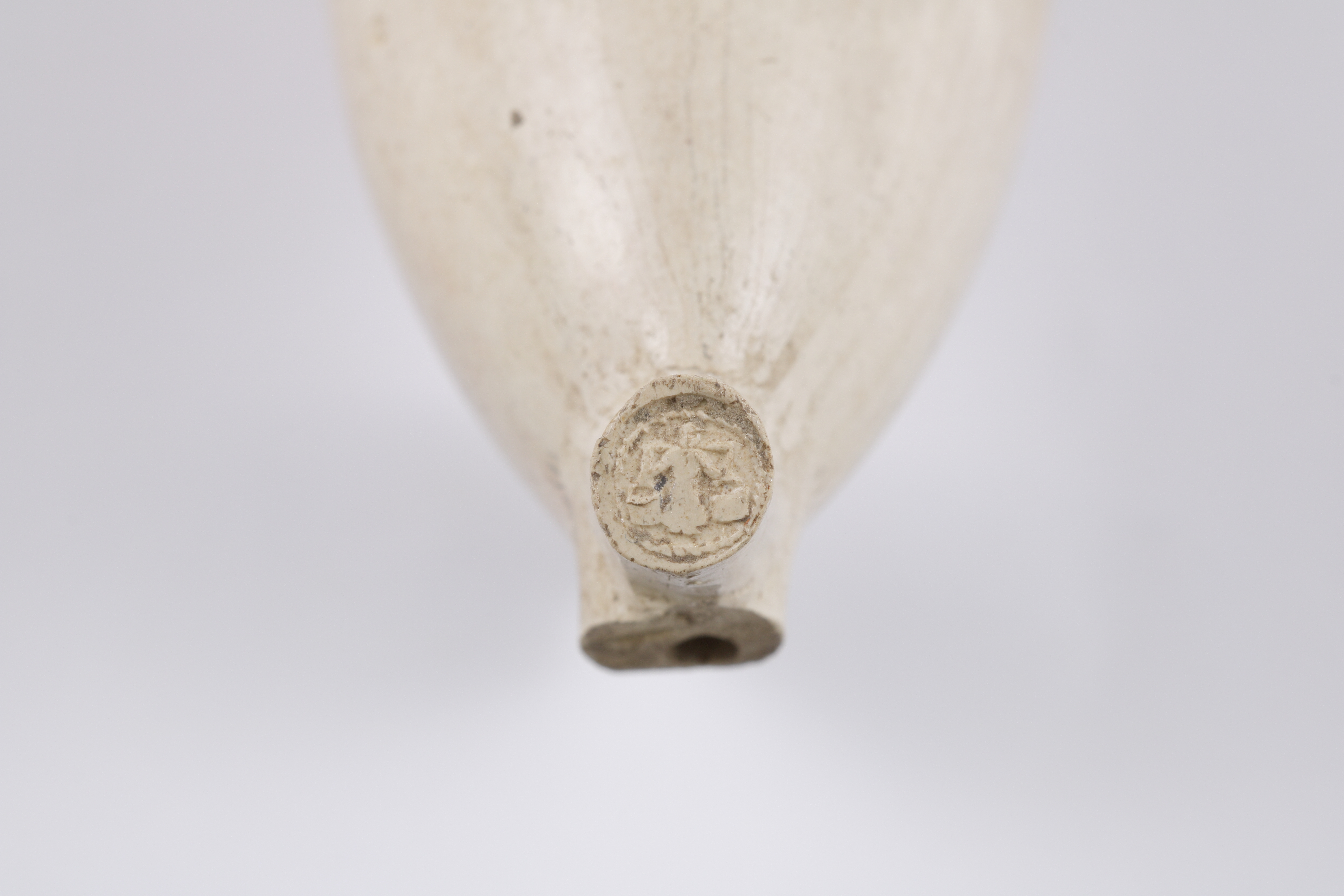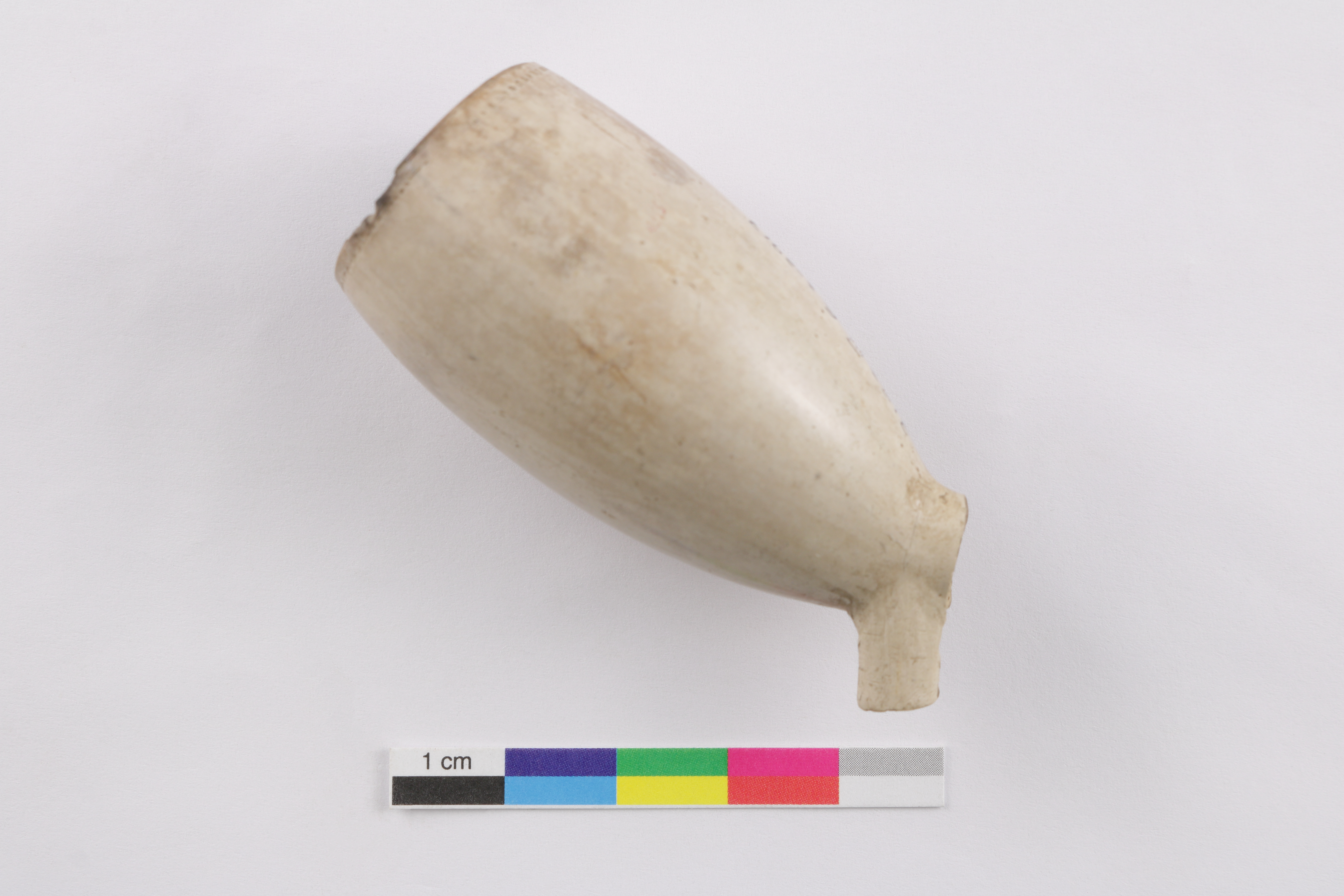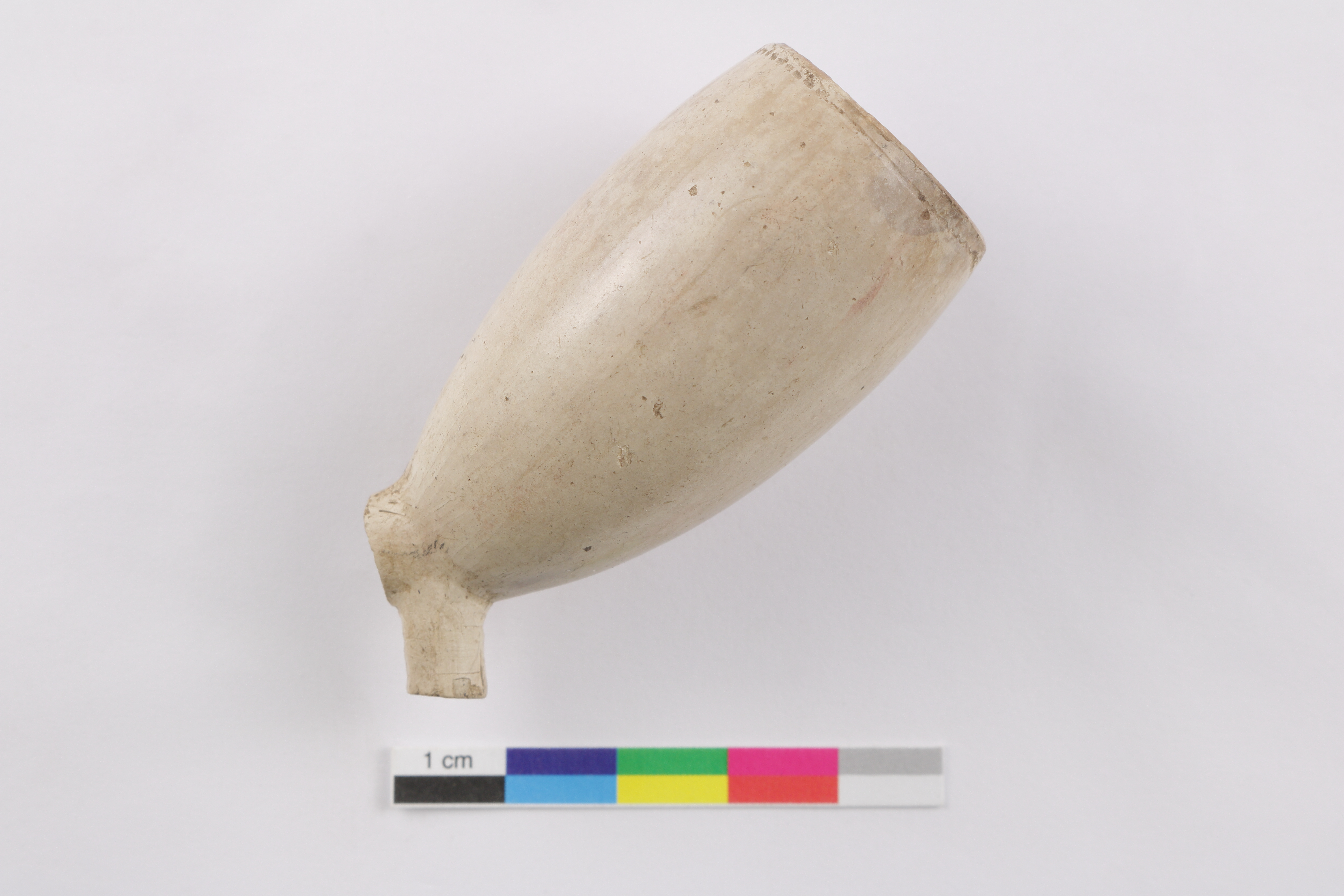 La pipe en terre cuite fine argileuse blanche, de type ovoïde, est liée à la consommation de narcotiques. L'objet, fabriqué avant 1900, est muni d'un talon droit accentué à bout plat. Le fourneau ovoïde de forte capacité forme un angle obtus avec le tuyau et l'ouverture est oblique par rapport à son axe. L'artéfact mesure 5,4 cm de longueur et le fourneau mesure 4,9 cm de hauteur et 2,5 cm de diamètre au rebord.