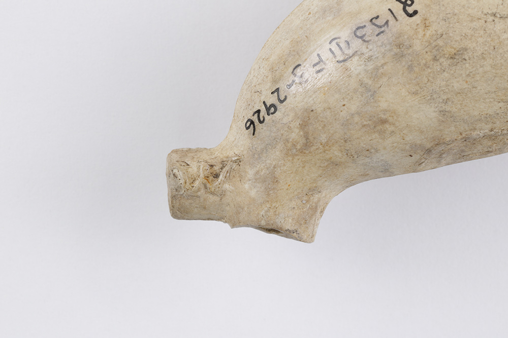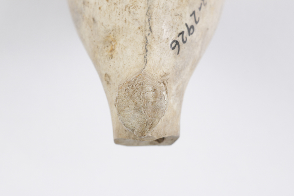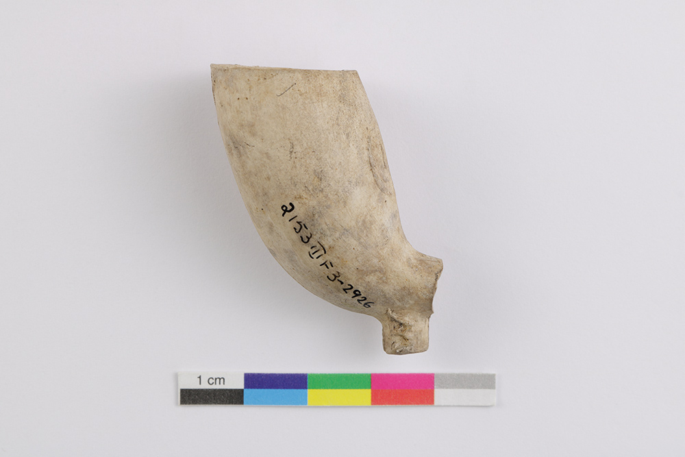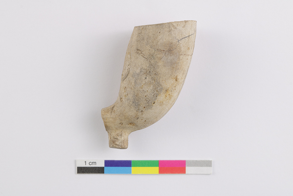 Le fourneau de pipe en terre cuite fine argileuse blanche est lié à la consommation de narcotiques. L'objet, fabriqué entre la fin du XVIIIe siècle et le début du XIXe siècle, est muni d'un talon plat accentué de section ronde. Le fourneau de capacité moyenne à forte forme un angle obtus avec le tuyau et l'ouverture est parallèle à son axe. L'artéfact mesure 3,3 cm de longueur, 3,8 cm de hauteur et 2,2 cm de diamètre au rebord.