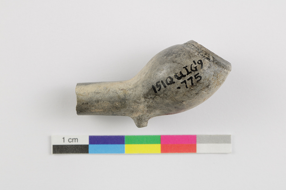 La pipe en terre cuite fine argileuse et blanche est liée à la consommation de narcotiques. L'objet, fabriqué dans le premier tiers du XVIIe siècle, est muni d'une ouverture resserrée et d'un éperon fuselé. Le fourneau trapu de capacité moyenne forme un angle très obtus avec le tuyau de la pipe et l'ouverture est oblique par rapport à son axe. L'artéfact mesure 4,2 cm de longueur et le fourneau, 2,4 cm de hauteur et 1,3 cm de diamètre au rebord.