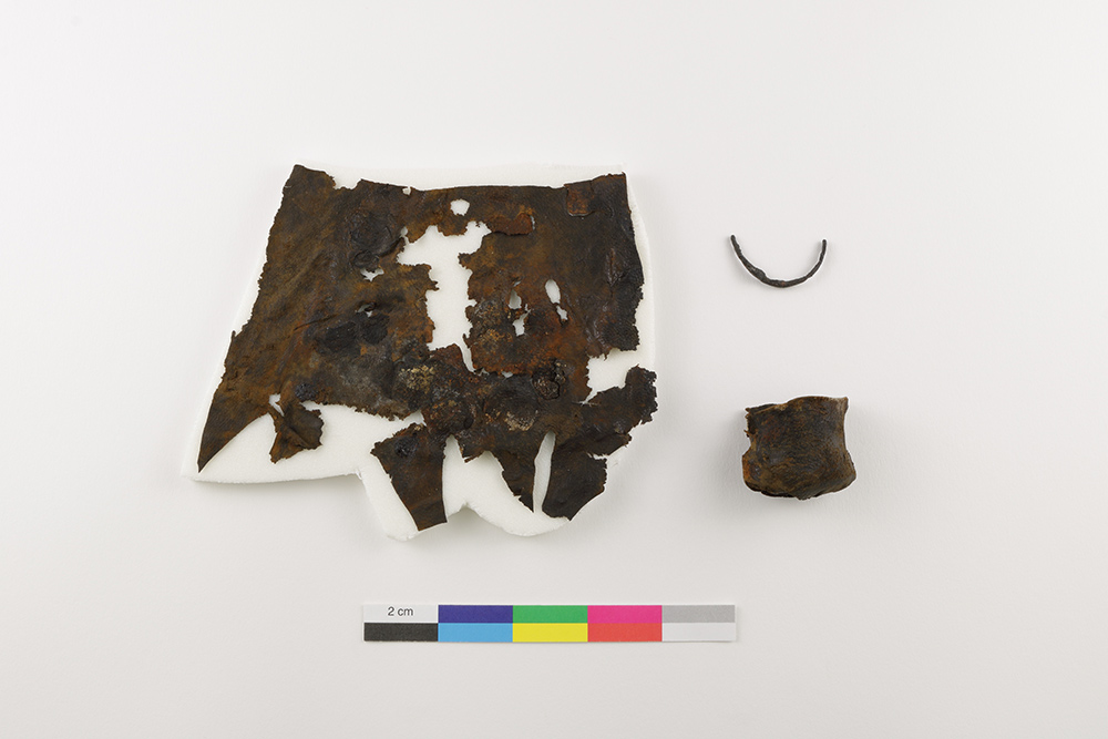 L'apôtre de bandoulière, fabriqué avant 1690, est un accessoire militaire. L'objet en cuir et en étain mesure 12,0 cm de longueur et 9,4 cm de diamètre. Incomplet, il compte 23 fragments, dont un fragment d'anneau en étain, la base du cylindre formée d'une pièce de cuir, un fragment de cuir trapézoïdal ainsi qu'une vingtaine de petits fragments de cuir.