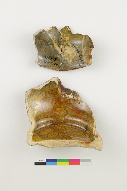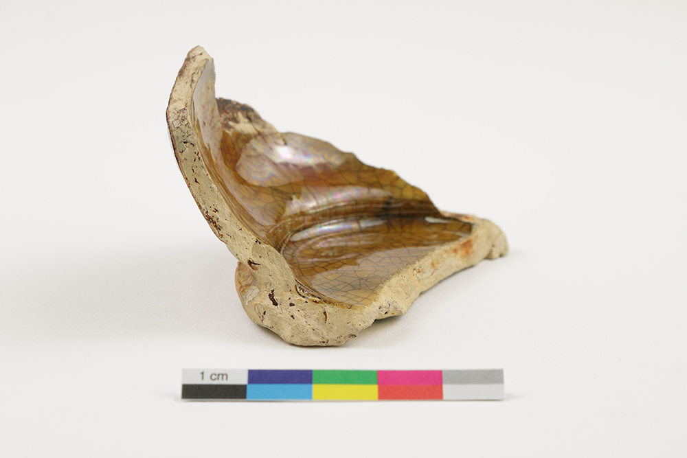 La chope, fabriquée avant 1690, est liée à l'alimentation. L'objet en céramique beige se compose de quatre fragments, dont trois sont jointifs, constituant une partie de la base et de la paroi de l'objet. Le fragment le plus gros mesure 4,2 cm de hauteur, 5,6 cm de largeur et 7,0 cm de diamètre, qui est aussi le diamètre du fond. La chope est recouverte d'un engobe rouge sous un engobe blanc, ce dernier ayant été gratté avec un outil pour créer des motifs de style « mille-feuille ».