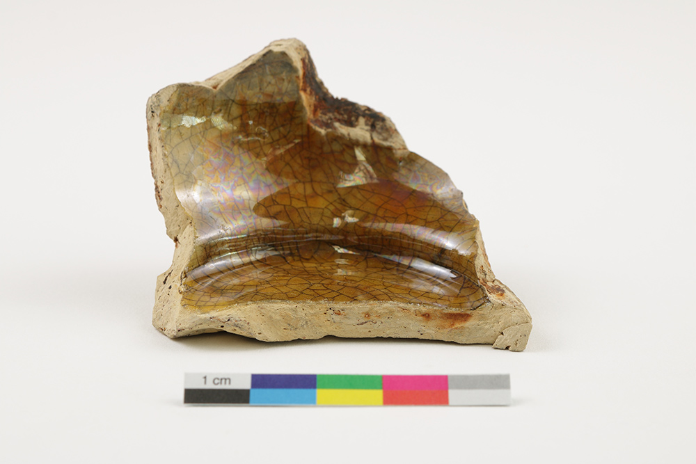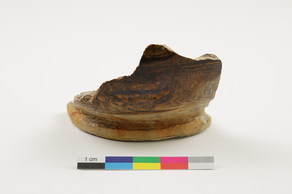 Cette chope en céramique est fabriquée en Angleterre avant 1690. L'artéfact est composé de quatre fragments, dont trois sont jointifs, constituant une partie de la base et de la paroi de l'objet. La pâte beige jaunâtre est recouverte d'un engobe rouge, lui-même couvert d'un engobe blanc qui a été gratté avec un outil, puis d'une glaçure transparente. Le peignage de l'engobe produit des motifs de style « mille-feuille ». La chope est un contenant utilisé pour la consommation de boissons froides ou tempérées, et notamment de la bière.