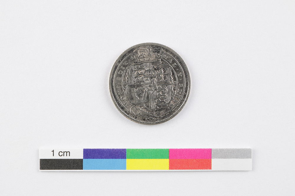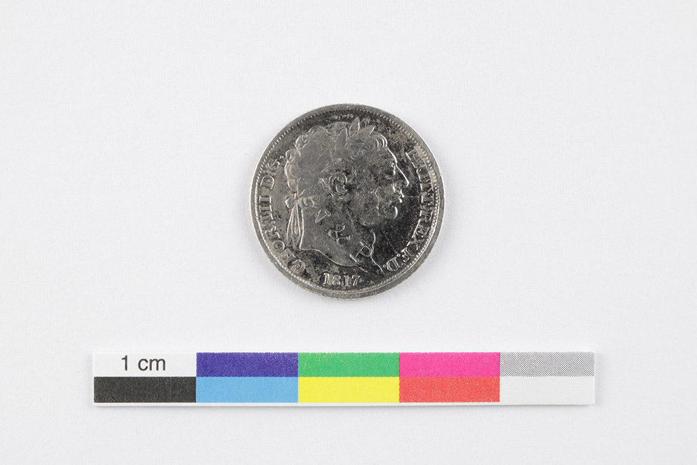 Cette monnaie en argent d'une valeur de six pence est frappée en 1817 à Londres, en Angleterre, sous le règne de Georges III (1738-1820). Petit-fils de Georges II (1683-1760), ce souverain, également prince électeur de Hanovre, accède au trône d'Angleterre en 1760. Il règne jusqu'en 1820, bien qu'atteint de crises de démence de plus en plus prononcées. Son fils, le futur Georges IV (1762-1830), doit assurer la régence dès 1811. Au cours de son long règne, il semblerait que les pièces de six pence n'aient été émises qu'en 1787 et annuellement de 1816 à 1820.