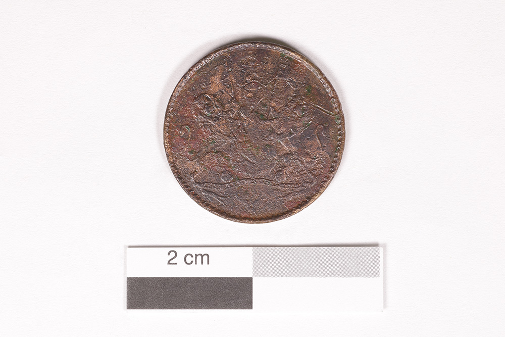 La monnaie, frappée en 1821, est un objet lié au commerce. Ce disque circulaire plat en cuivre mesure 2,85 cm de diamètre. L'avers de la pièce affiche les armoiries de la Compagnie des Indes orientales et le revers présente une couronne de laurier.