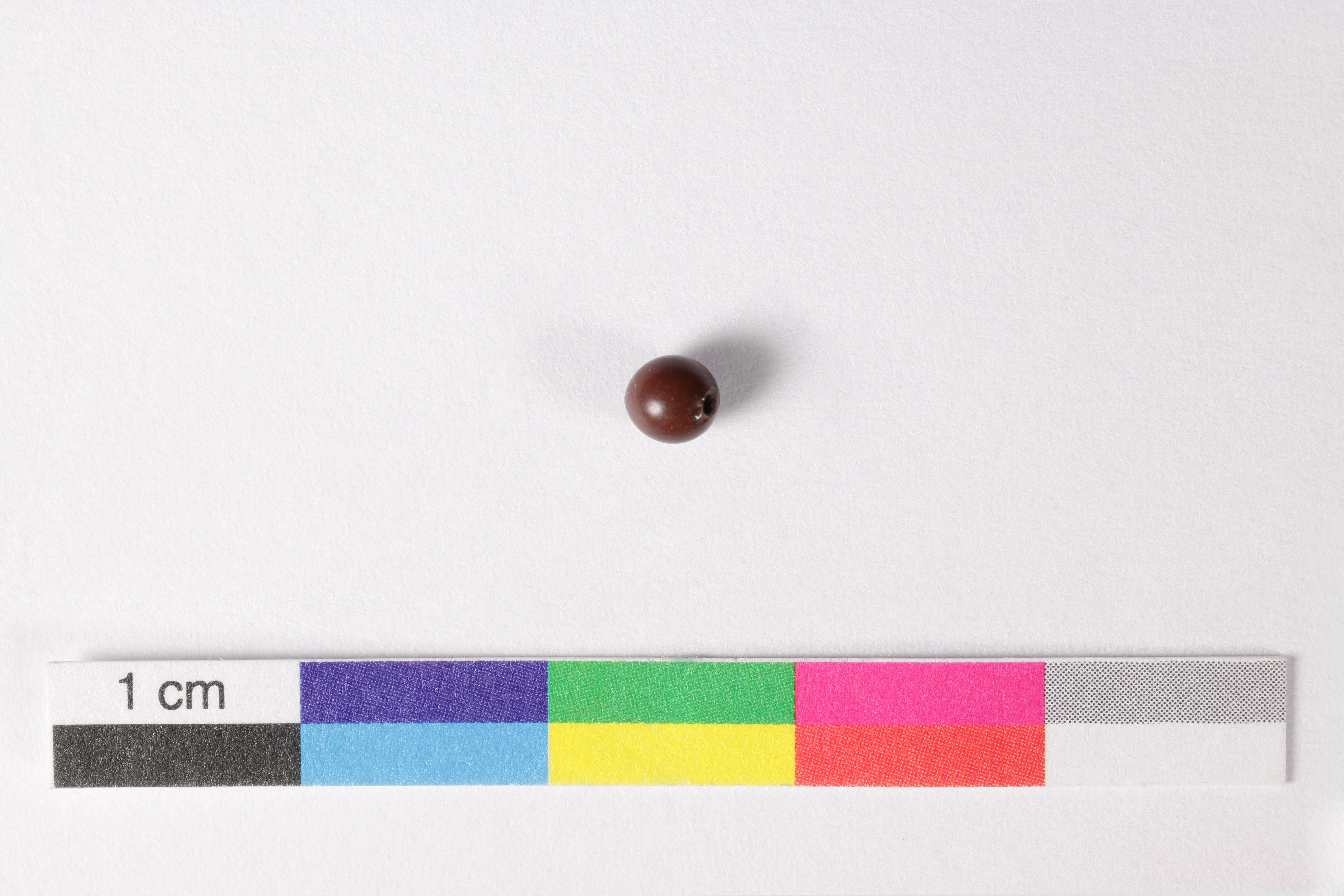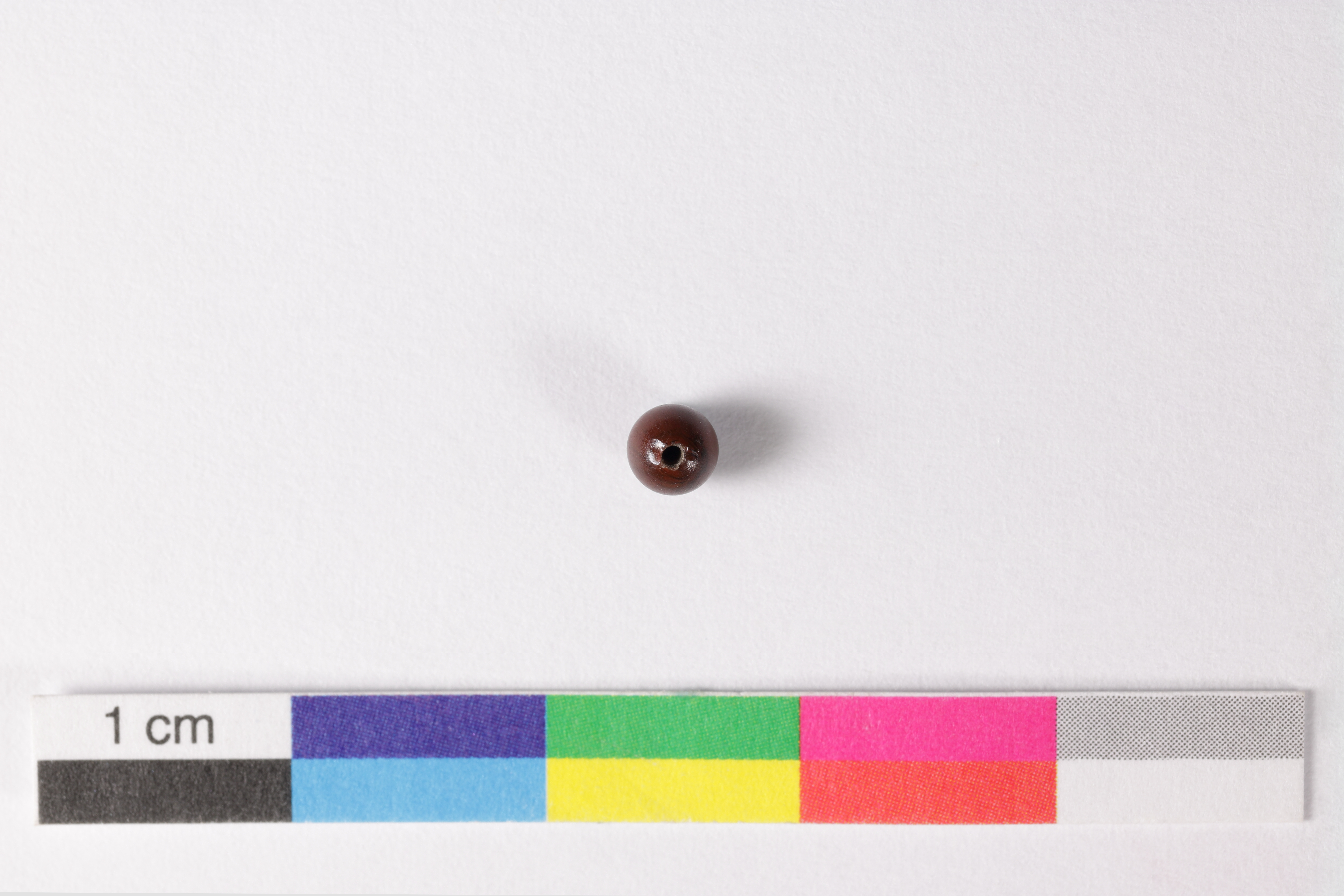 La perle est un accessoire de parure et provient d'un contexte archéologique daté entre 1643 et 1665. L'objet en verre opaque coloré rouge mesure 0,35 cm de diamètre. La perle est de forme sphérique et elle est légèrement renflée aux pôles. Elle est percée d'un petit trou qui la traverse d'un pôle à l'autre.