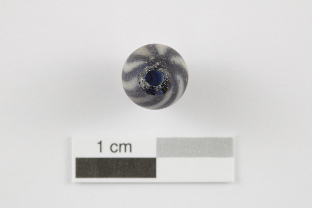 La perle ovale en verre, servant aux échanges avec les populations autochtones et à la parure des Européens (bijoux, chapelets, habillement), est fabriquée entre le XVIe et le XIXe siècle. Elle est faite d'une couche de verre bleu cobalt transparent. Elle est entière et est décorée de 10 lignes droites de verre blanc opaque. L'artéfact mesure 11,4 mm de longueur et 8,2 mm de diamètre.