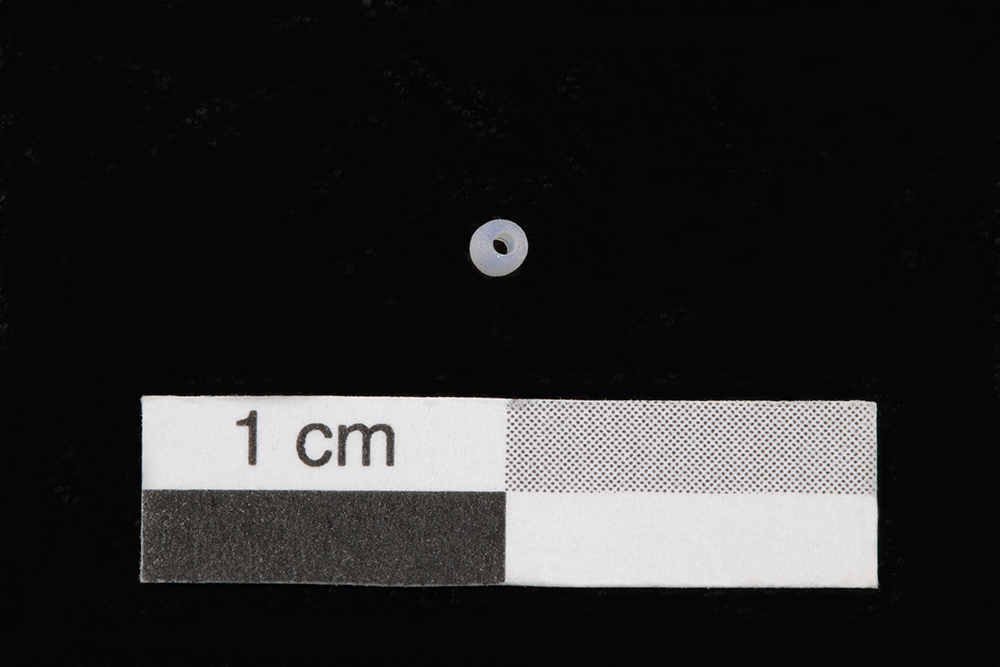 La perle, servant aux échanges avec les populations autochtones et à la parure des Européens (bijoux, chapelets, habillement), est fabriquée entre le XVIe et le XIXe siècle. Elle est faite d'une couche de verre opale (appelé « pale blue »). Elle mesure 1,0 mm de longueur sur 1,5 mm de diamètre. Elle est ronde, de style « beignet ».