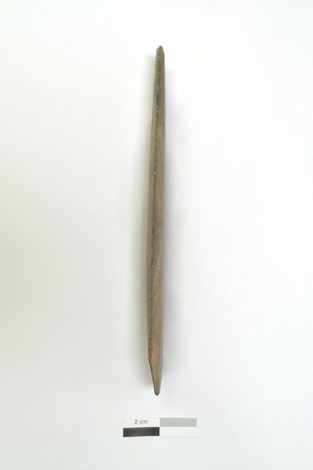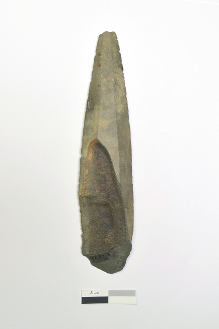 La pointe lancéolée est faite d'une pierre tendre, possiblement une argilite grisâtre. L'objet, lié à la chasse ou à la guerre, date de l'Archaïque récent (5 500 à 3 000 avant aujourd'hui). La pointe pourrait aussi avoir une fonction symbolique. L'artéfact est incomplet et la base est manquante. Il mesure 17,8 cm de longueur résiduelle, 4 cm de largeur et 0,8 cm d'épaisseur.
