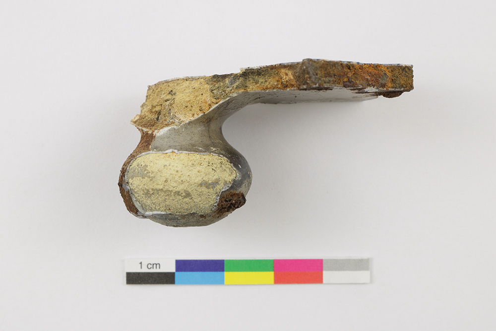 L'artéfact est mis au jour en 1989 sur le site de l'îlot des Palais, à Québec, dans la salle centrale (salle 4) des caves du premier palais de l'intendant. Cette salle est utilisée par les intendants de Nouvelle-France entre 1684 et 1713. Les artéfacts retrouvés dans ce lieu sont de deux natures différentes. Ils consistent en marchandises qui appartenaient au roi et en articles d'usage domestique utilisés par les intendants. Les marchandises, distribuées dans la colonie, servent à l'armement. Les articles d'usage domestique indiquent que les intendants se servent de cette salle des caves, du moins peu avant le feu de 1713, pour l'entreposage d'une portion de leurs biens, notamment des articles en céramique et en verre.