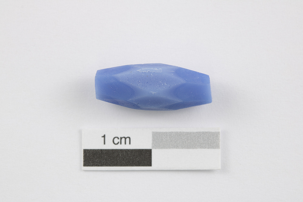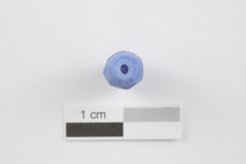 La perle ovale et facettée de verre, servant aux échanges avec les populations autochtones et à la parure des Européens (bijoux, chapelets, habillement), est fabriquée entre le XVIe et le XIXe siècle. Elle est faite de deux couches de verre, soit du verre bleu opaque et du verre bleu pâle opaque, de l'extérieur vers l'intérieur. Elle est entière et est dépourvue de décor. L'artéfact mesure 16,8 mm de longueur et de 6,8 mm de diamètre.