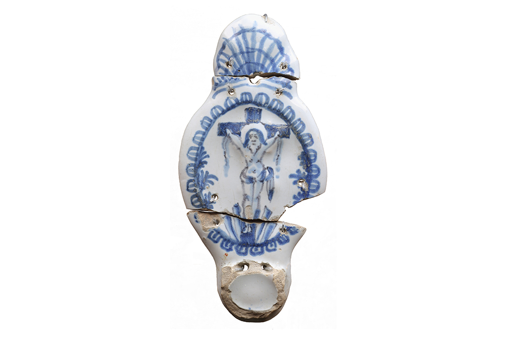 Le bénitier d'applique en faïence blanche de grand feu est un objet religieux. Fabriqué au milieu du XVIIIe siècle, il est incomplet et fragmenté. L'objet prend la forme d'une plaque ovale surmontée d'un lobe. Le bassin est manquant à sa base et des trous de réparations sont visibles sur le bénitier. L'artéfact est décoré en camaïeu bleu et mesure 18 cm de hauteur et 8,5 cm de largeur.