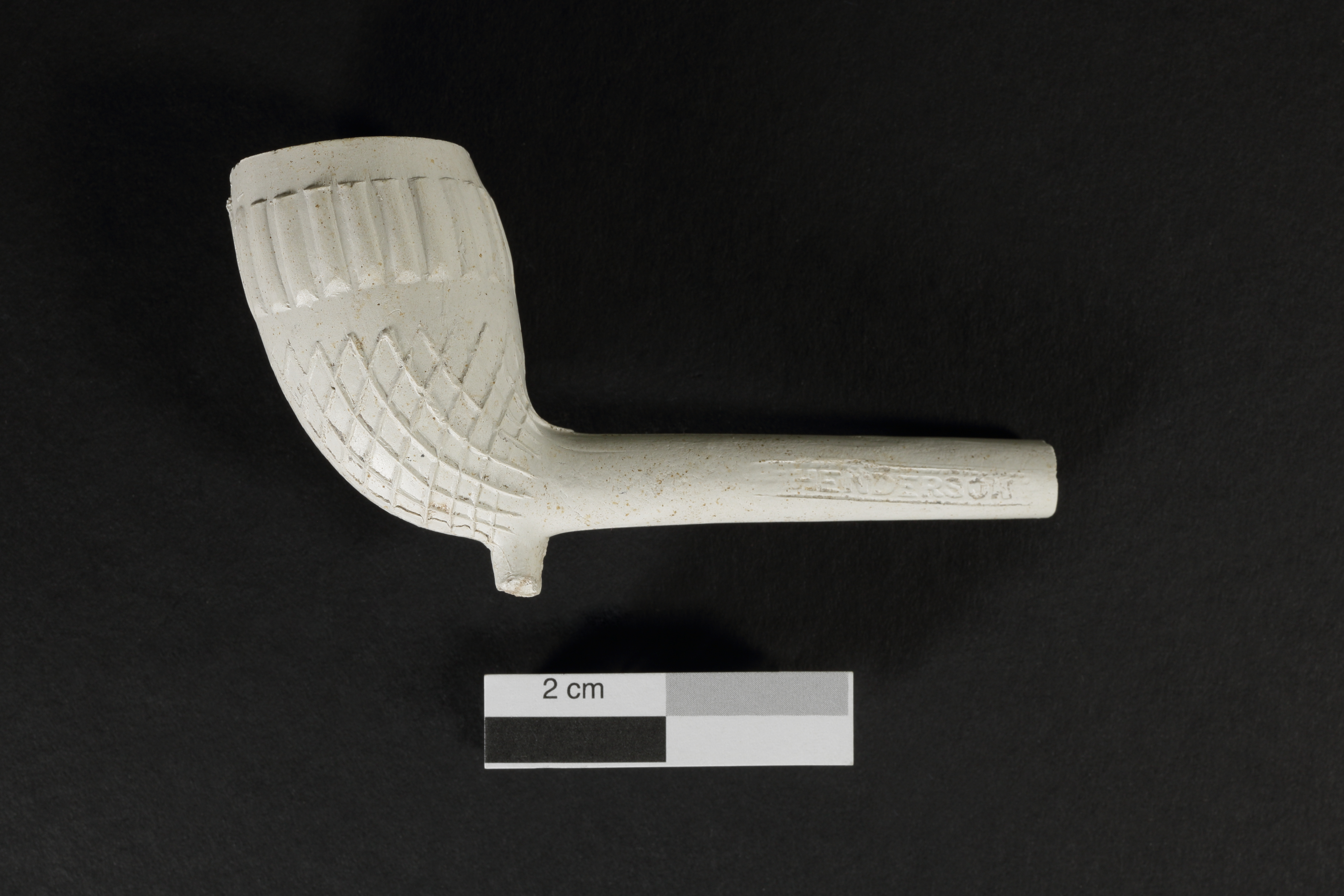 La pipe en terre cuite fine, de facture assez soignée, provient du dépotoir de la fabrique de pipes à fumer Henderson. Les marques « HENDERSON » et « MONTRÉAL » sont présentes de part et d'autre du tuyau. La pipe n'a pas servi, car l'intérieur du fourneau ne porte aucune trace de combustion.