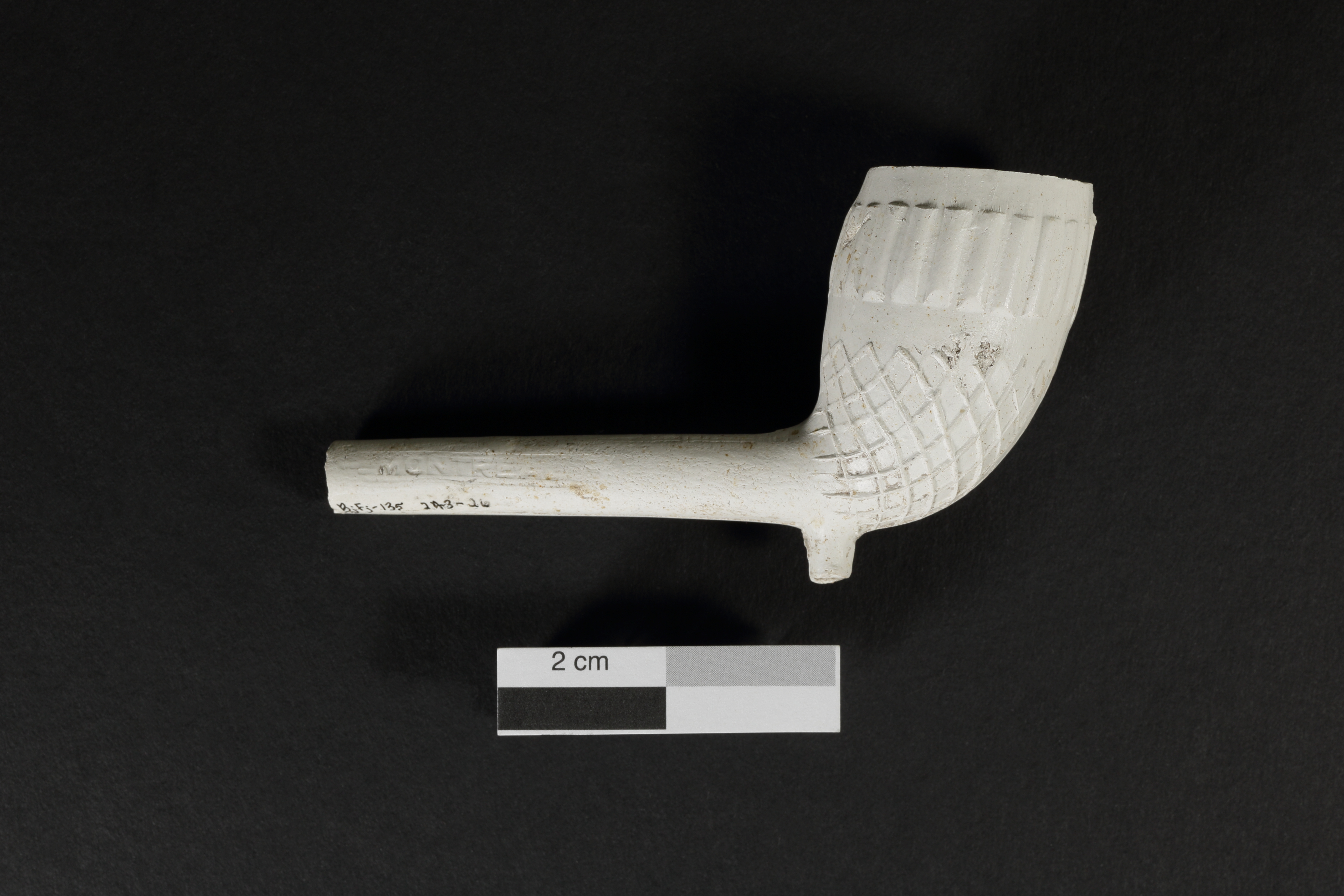 La pipe en terre cuite fine argileuse blanche, de type « TD », est liée à la consommation de narcotiques. L'objet, fabriqué entre 1847 et 1876, est muni d'un éperon fuselé à bout plat et d'un tuyau droit. Le fourneau cylindrique de forte capacité forme un angle presque droit avec le tuyau et l'ouverture est parallèle à son axe. Une section du tuyau et l'embout sont manquants. L'artéfact mesure 9,1 cm de longueur et le fourneau mesure 4,3 cm de hauteur et entre 2,3 et 2,7 cm de diamètre au rebord.