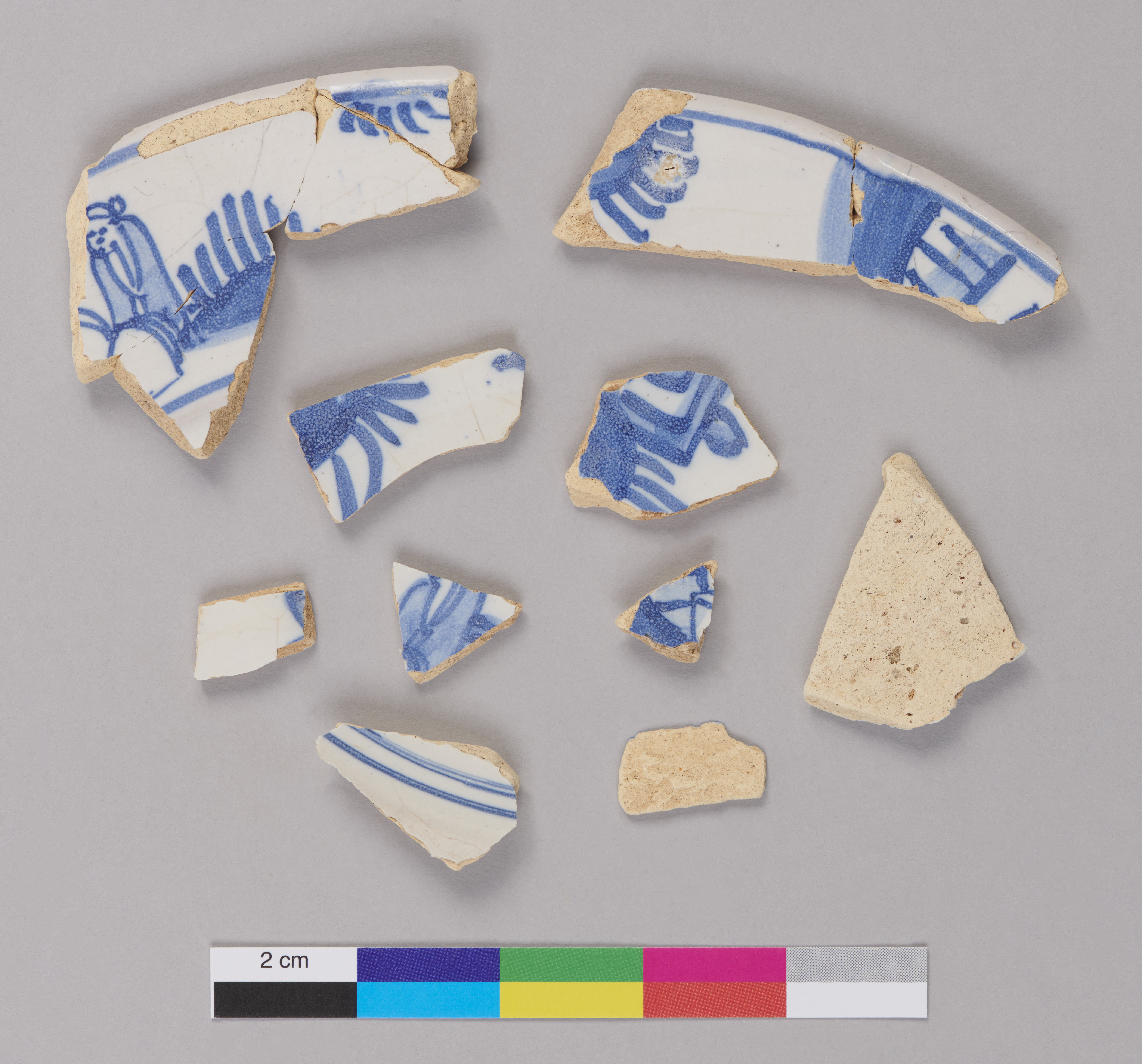 Les fragments d'assiette en faïence font partie d'un récipient fabriqué en Angleterre à la fin du XVIIe siècle. Les décors d'inspiration orientale ornant l'assiette, comprenant un personnage chinois et des motifs géométriques peints en bleu sur l'aile, rappellent les productions anglaises de la fin du XVIIe et du début du XVIIIe siècle.