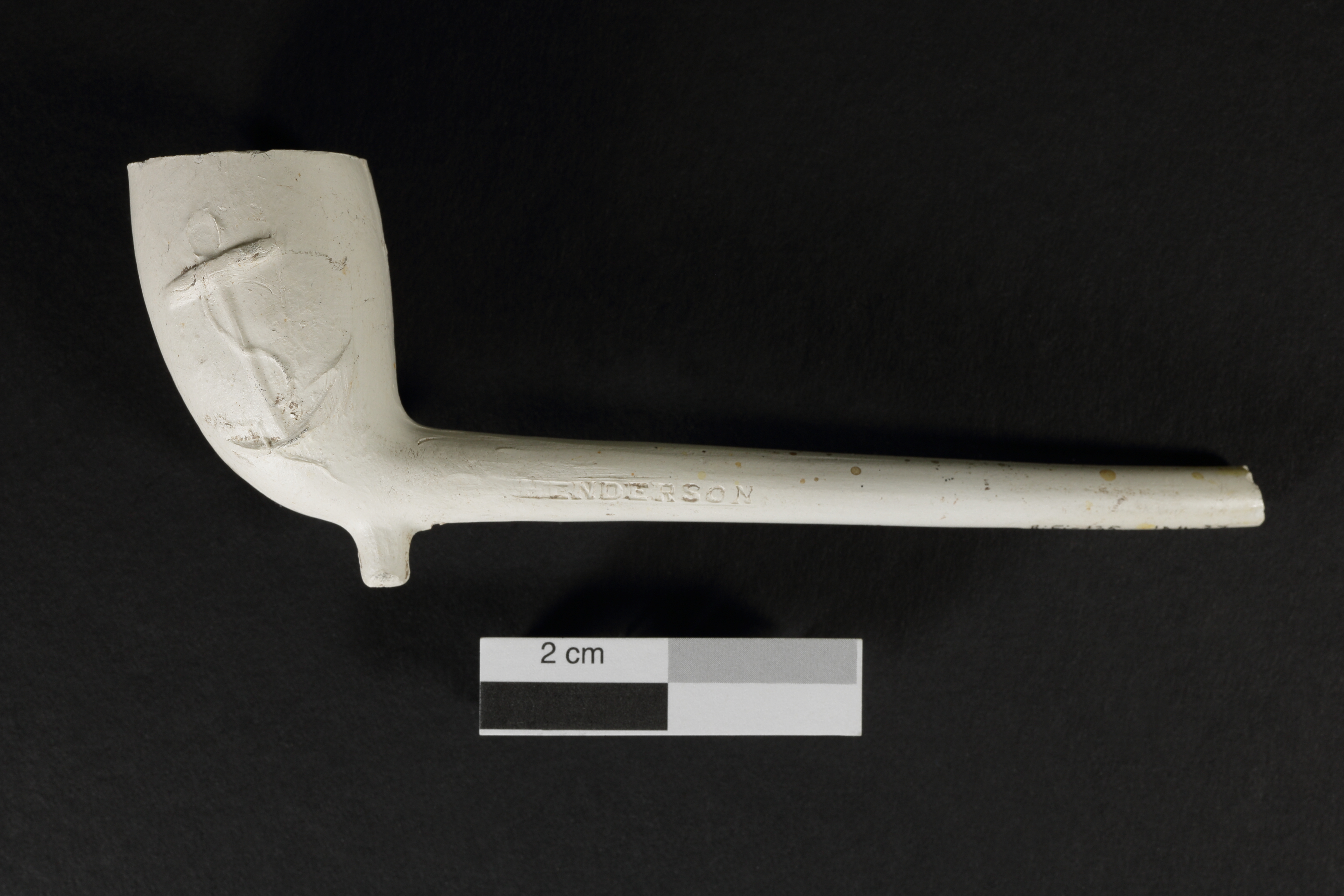 La pipe en terre cuite fine est de facture peu soignée. Il s'agit d'un rejet de production qui témoigne des activités manufacturières de la famille Henderson entre 1847 et 1876. Les marques « HENDERSON », à gauche, et « MONTRÉAL », à droite, sont présentes de part et d'autre du tuyau. La pipe n'a pas servi, car l'intérieur du fourneau ne porte aucune trace de combustion.