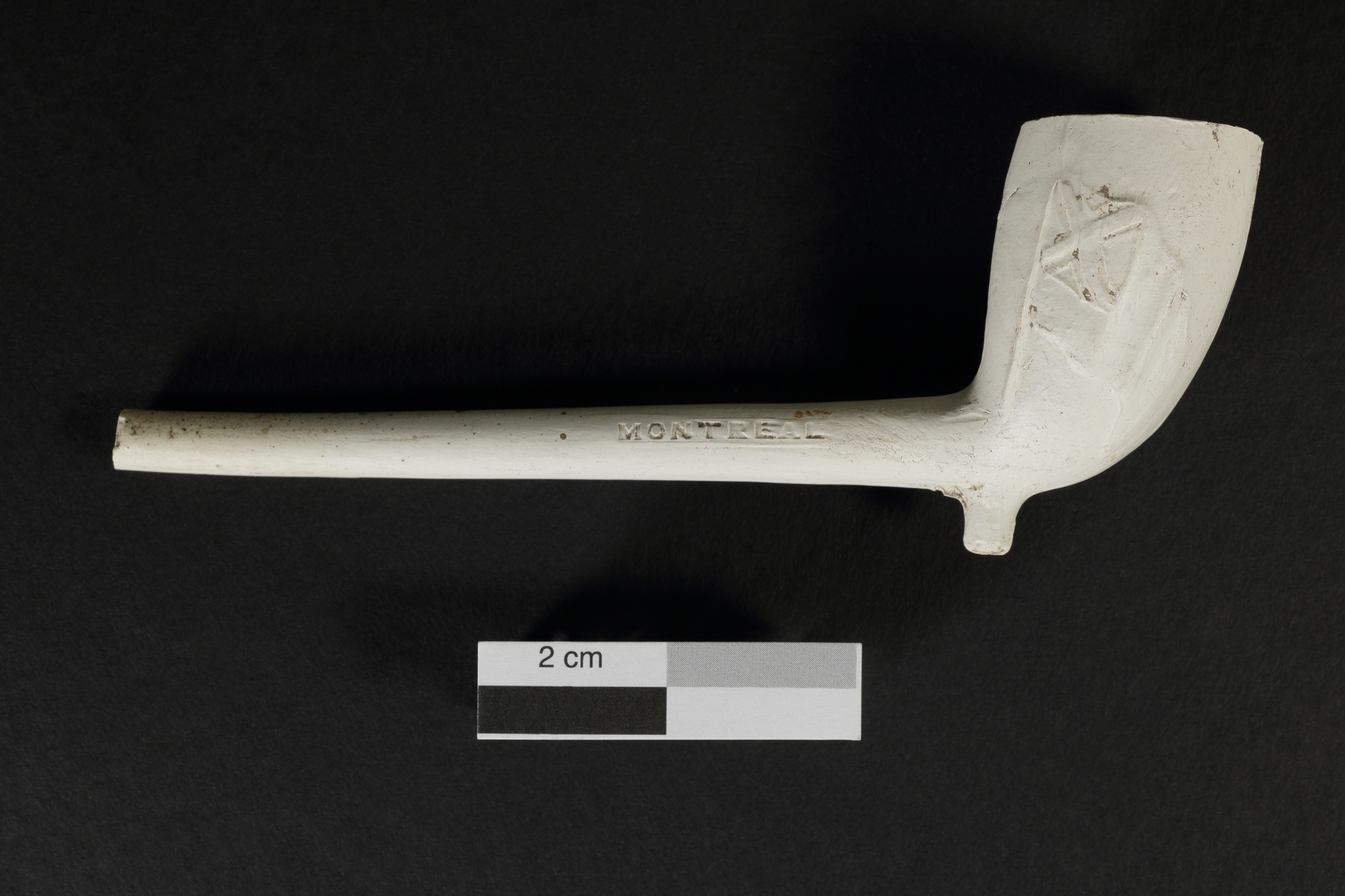 La pipe en terre cuite fine argileuse blanche, de type « TD », est liée à la consommation de narcotiques. L'objet, fabriqué entre 1846 et 1877, est muni d'un éperon fuselé à bout plat et d'un tuyau droit. Le fourneau cylindrique de forte capacité forme un angle droit avec le tuyau et l'ouverture est parallèle à son axe. Une section du tuyau et l'embout sont manquants. L'artéfact mesure 12,3 cm de longueur et le fourneau mesure 3,9 cm de hauteur et 2,5 cm de diamètre au rebord.
