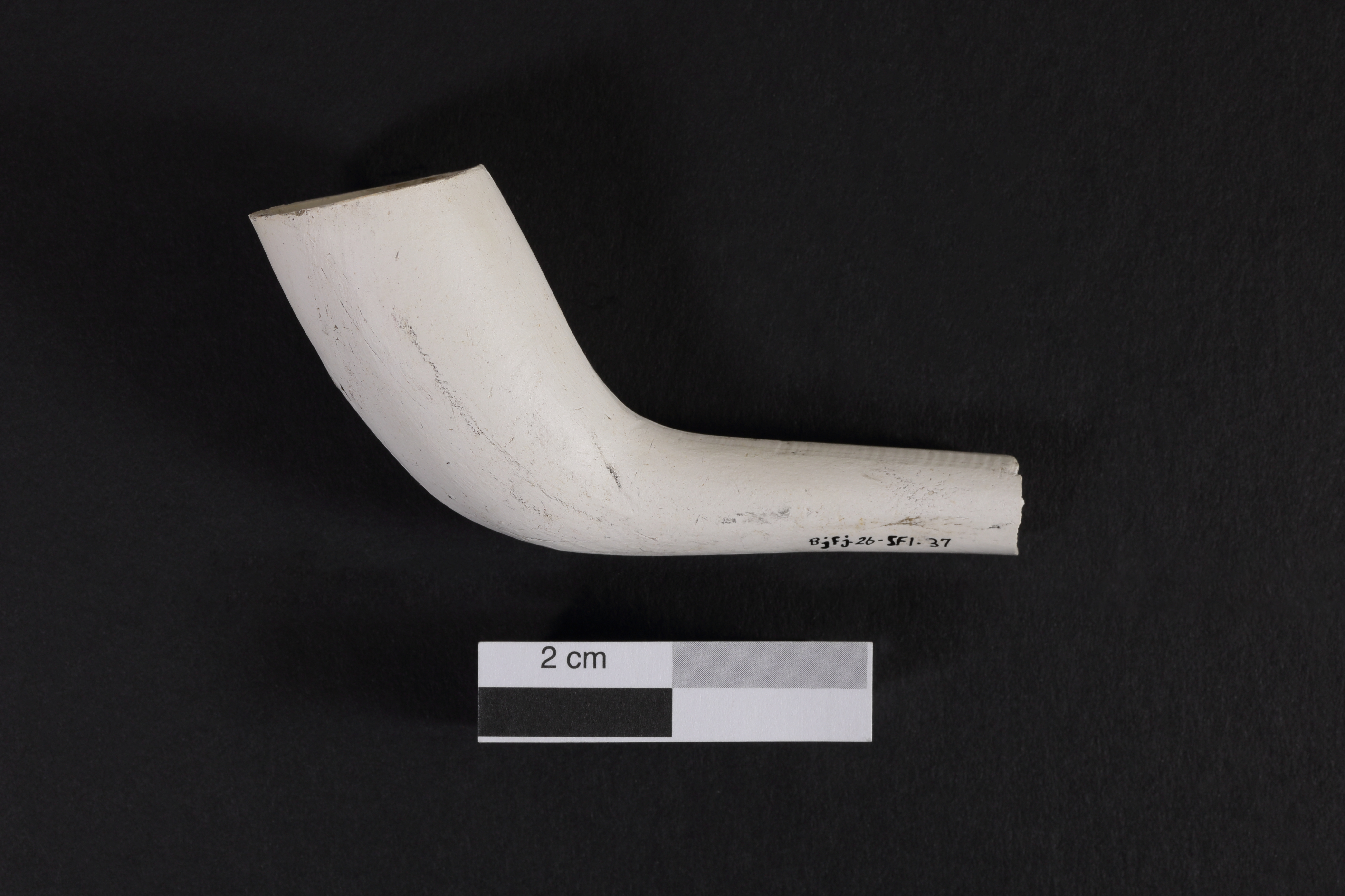 La pipe en terre cuite fine argileuse blanche, de type « Woodstock », est liée à la consommation de narcotiques. L'objet, fabriqué entre 1869 et 1903, est muni d'un gros tuyau droit et est dépourvu d'éperon. Le fourneau cylindrique allongé de forte capacité forme un angle obtus avec le tuyau et l'ouverture est oblique par rapport à son axe. Une section du tuyau et l'embout sont manquants. L'artéfact mesure 8,2 cm de longueur et le fourneau mesure 4,1 cm de hauteur et 2,45 cm de diamètre au rebord.
