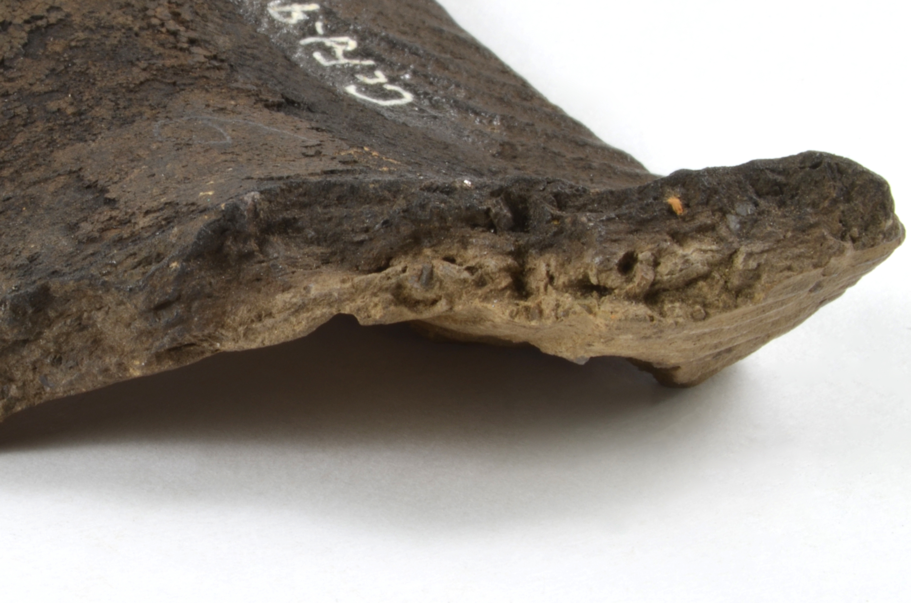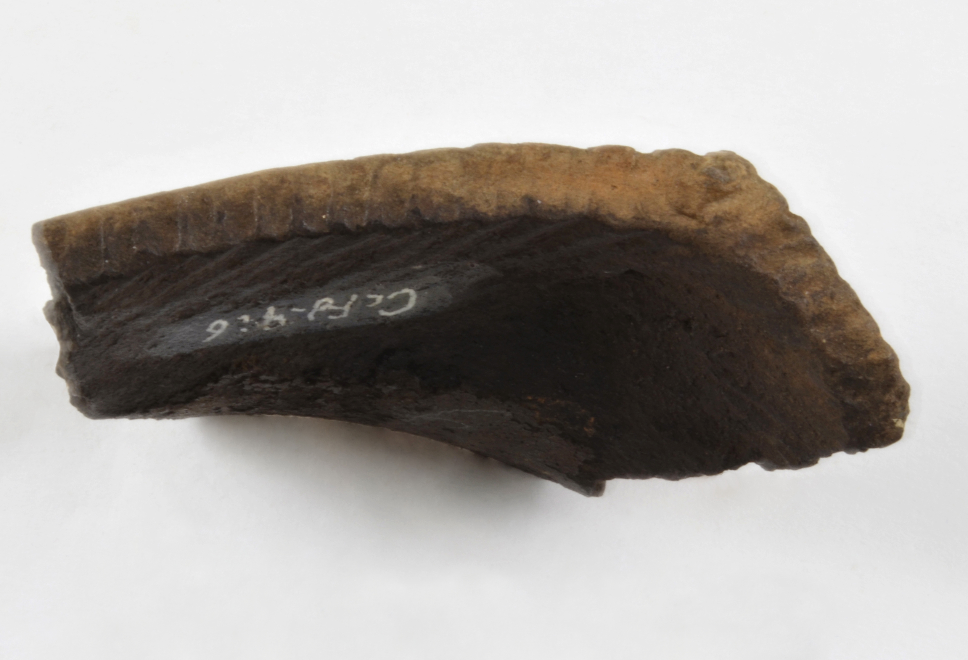 Le fragment de vase à parement et à crestellation date du milieu du Sylvicole supérieur (1 000 à 450 ans avant aujourd'hui). L'intérieur porte des croûtes carbonisées témoignant de son usage pour cuire des aliments.