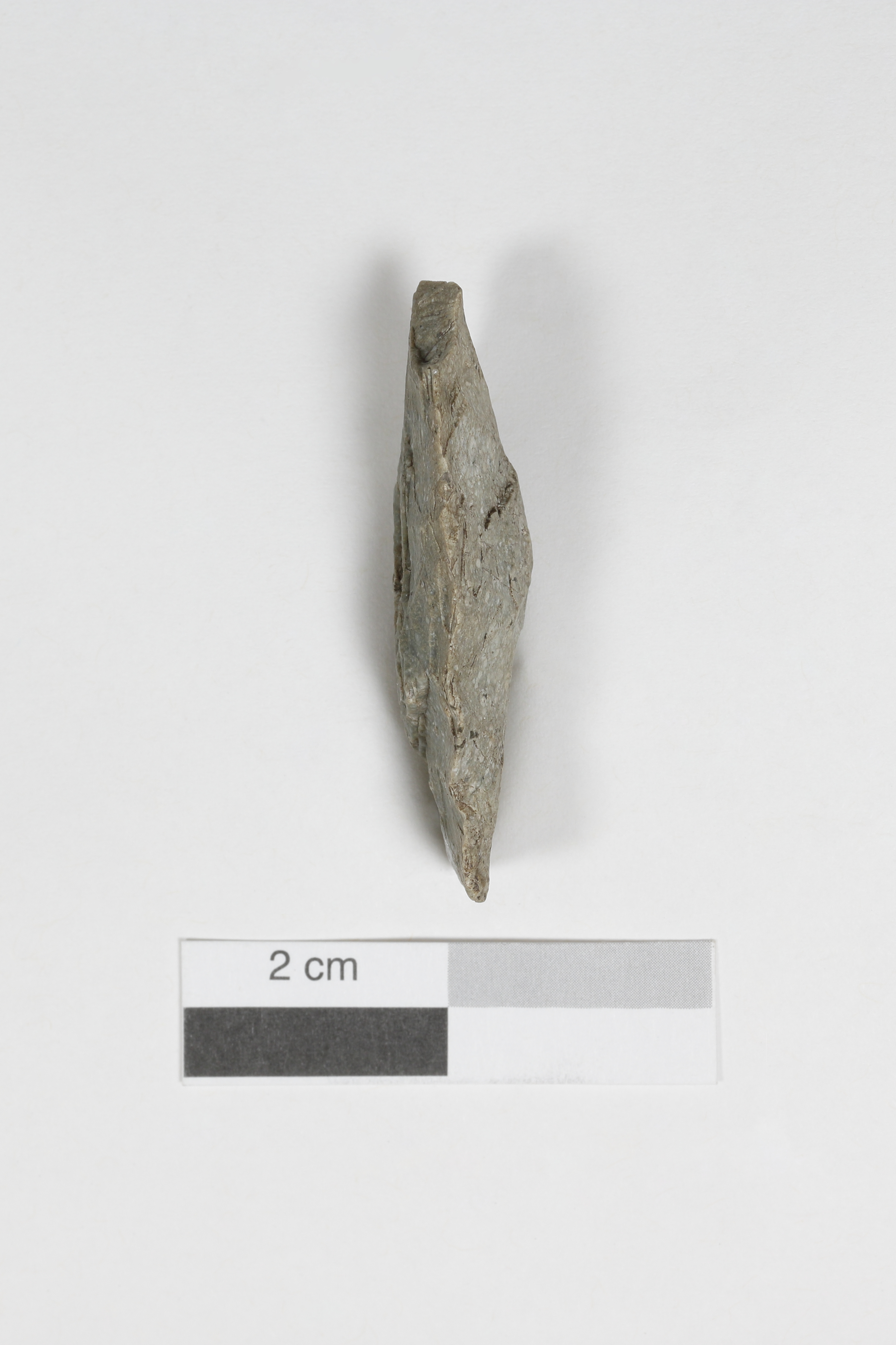 La pointe à encoches latérales de type « Otter Creek » est faite dans une matière siliceuse qui correspond probablement à une variété de rhyolite. L'objet, lié à la chasse ou à la guerre, date de la phase Vergennes de l'Archaïque récent laurentien (5 500 à 4200 ans avant aujourd'hui). L'artéfact est presque complet et il ne manque que le sommet qui est cassé. Il mesure 4,5 cm de longueur, 2,4 cm de largeur et 0,1 cm d'épaisseur.