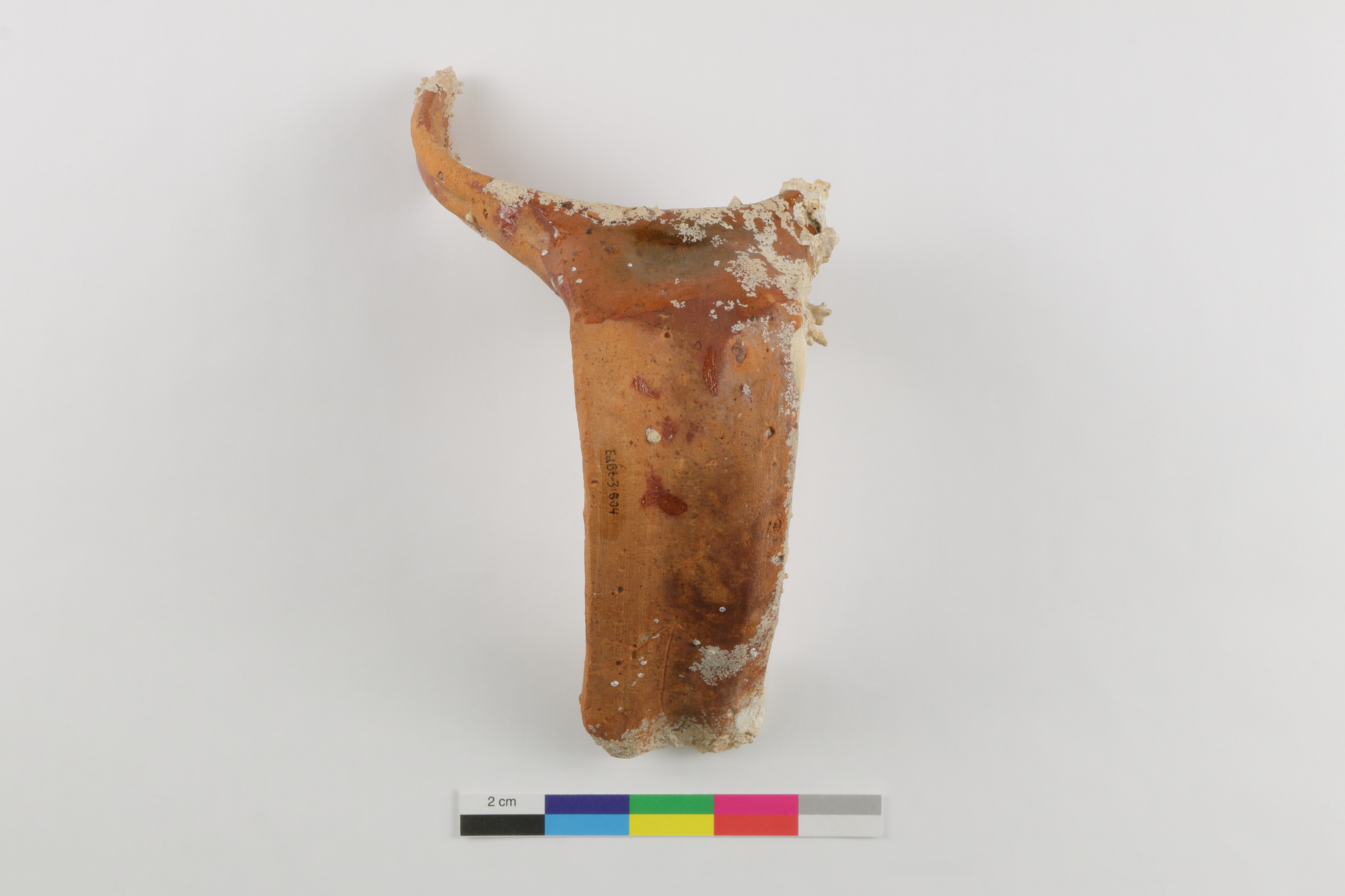 Le fragment de pot à anse provient d'un objet fabriqué au cours du XVIe ou au début du XVIIe siècle, probablement en Espagne ou en France. Il est façonné d'une terre cuite grossière à pâte rougeâtre. La partie basse de l'anse présente une incision à motif de flèche verticale pointant vers le haut. Comme les grandes jarres ou les marmites à pâte rougeâtre retrouvées sur le site, ce pot à anse est partiellement recouvert d'une glaçure au niveau du rebord et du haut de l'anse.