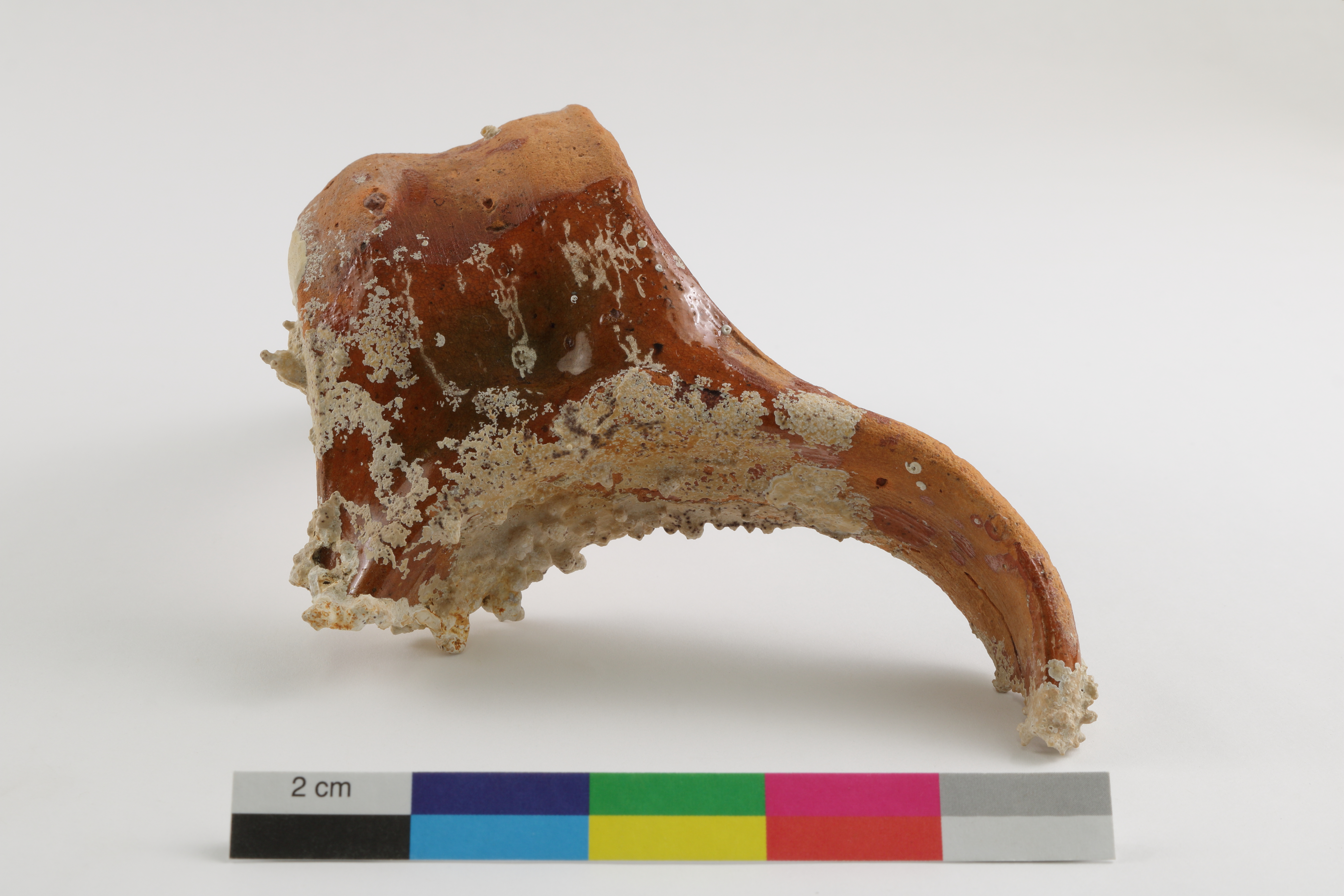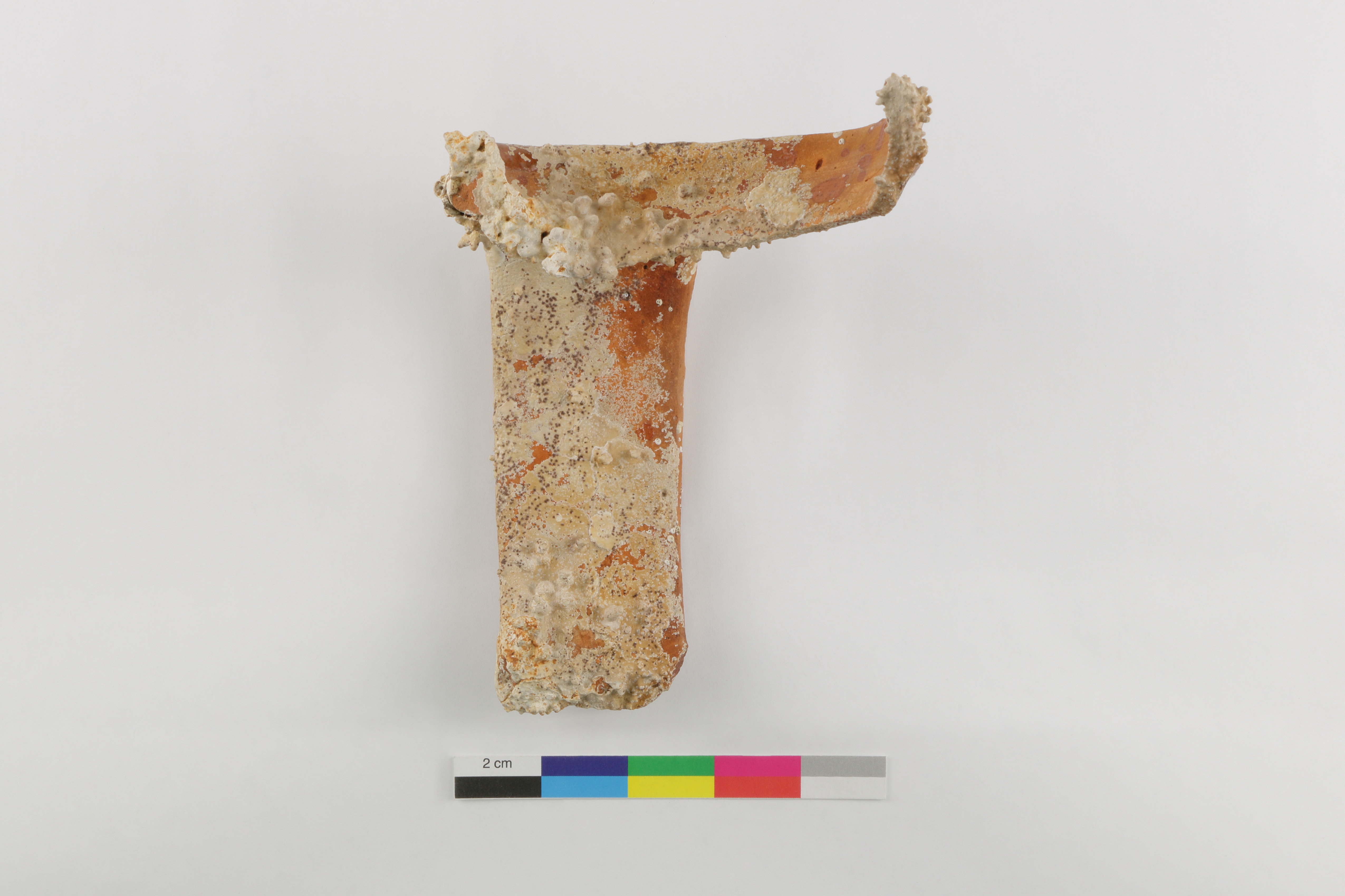 Des organismes marins (corail et coquilles) se sont logés sur le pot à anse au cours de son séjour sur le fond marin.