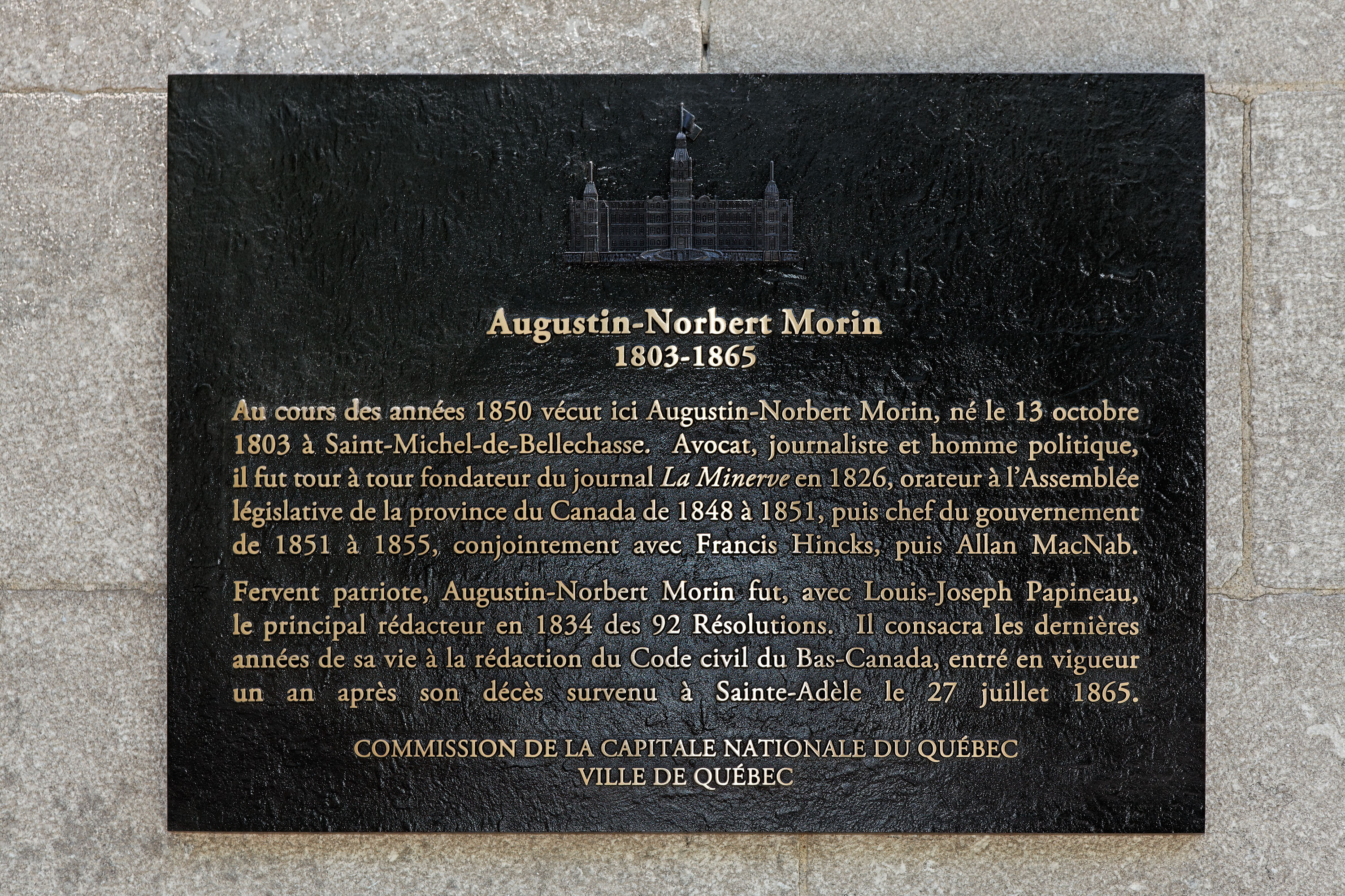 "Cette épigraphe est installée en l'honneur d'Augustin-Norbert Morin, avocat, journaliste et homme politique né le 13 octobre 1803 à Saint-Michel-de-Bellechasse.