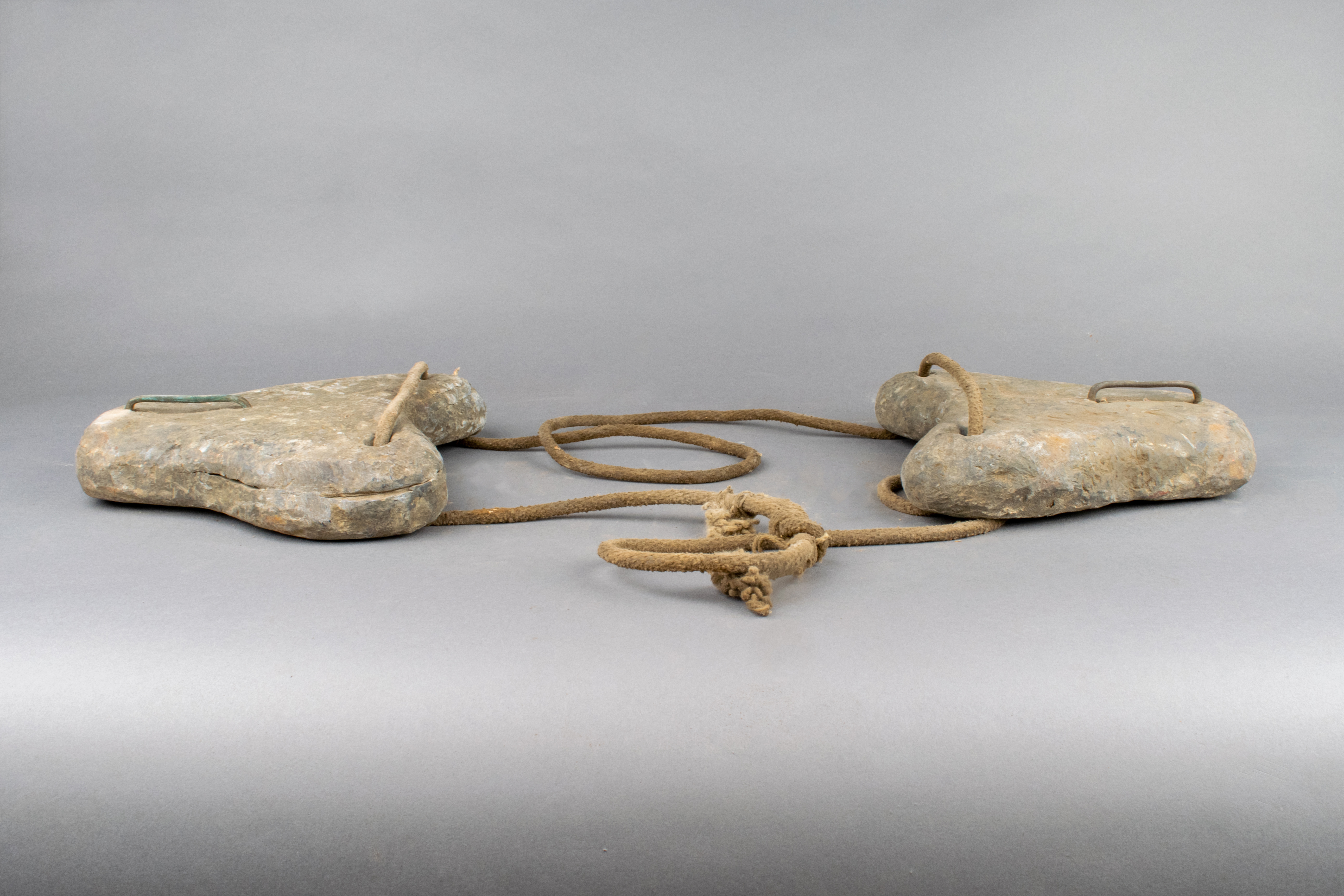 La bavette lestée fait partie de l'équipement du scaphandre à casque et mesure 23,5 cm de longueur sur 22,0 cm de largeur. Elle est composée de deux poids en plomb en forme de coeur. Chacun présente deux perforations qui permettent de relier les poids avec une corde ainsi qu'une attache en métal cuivreux insérée à la pointe du plomb.