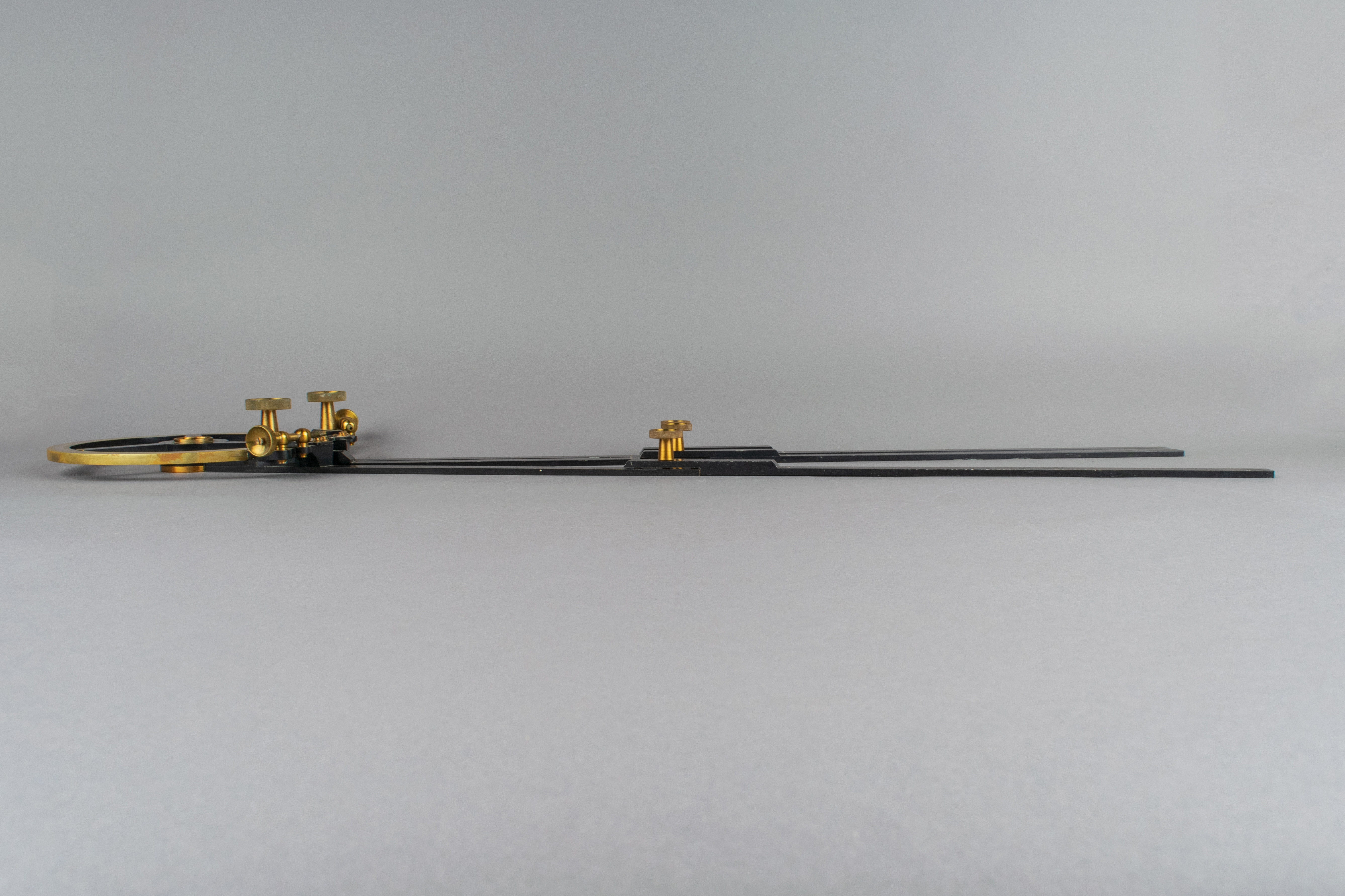 Le stigmographe est un instrument de navigation en laiton et en métal noir mesurant 40,8 cm de longueur. Il se compose d'un limbe, gradué deux fois de 0 à 180 degrés de part et d'autre d'un bras central fixe, et de deux bras mobiles en rotation pouvant être fixés à l'aide de vis de serrage en laiton et portant chacun un vernier gradué de 0 à 30 degrés. Les bras, en métal noir, peuvent être allongés à l'aide de réglettes et de vis de serrage qui se trouvent dans la boîte de l'instrument. L'intérieur de la boîte est tapissé de feutre vert.