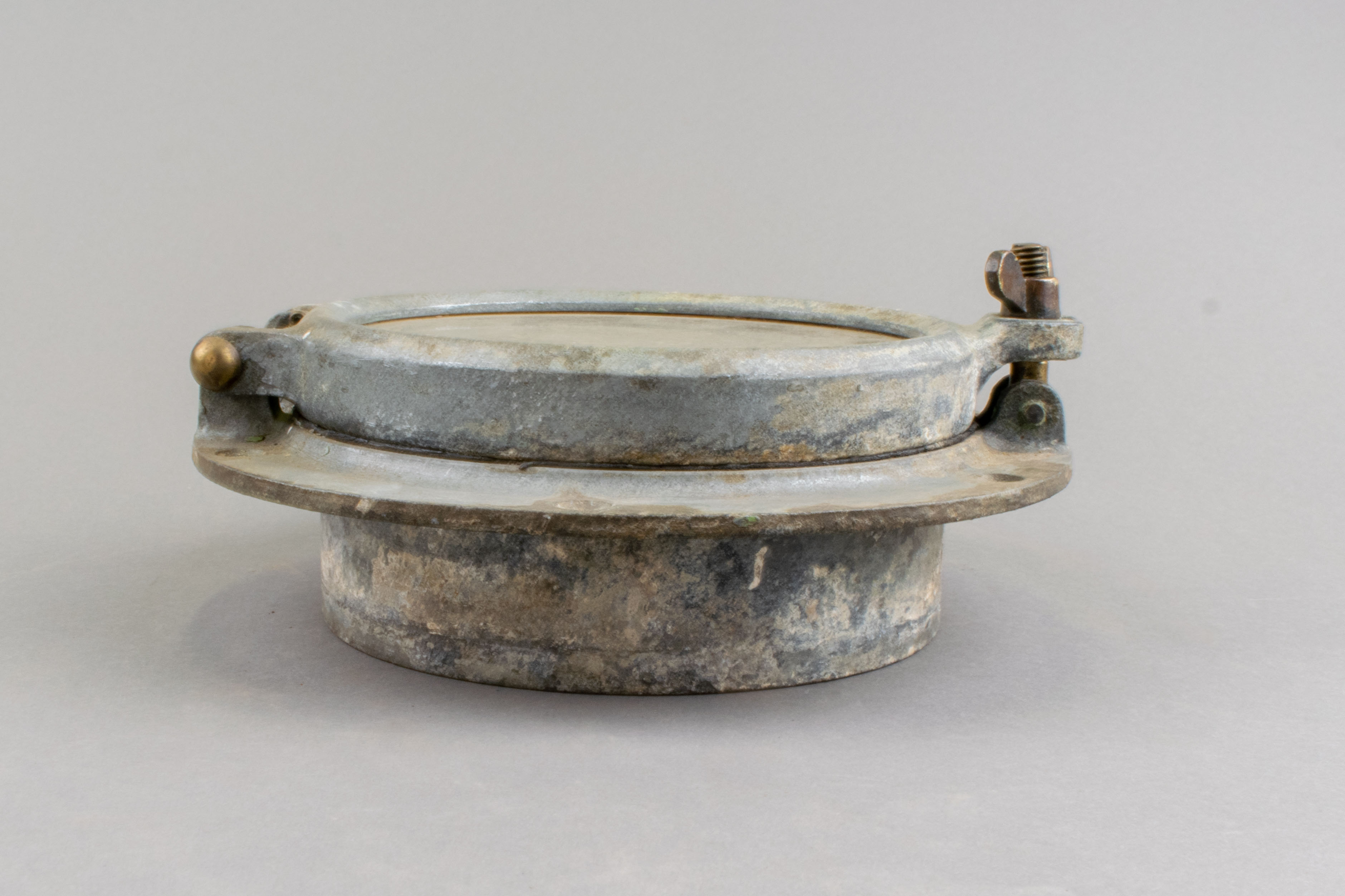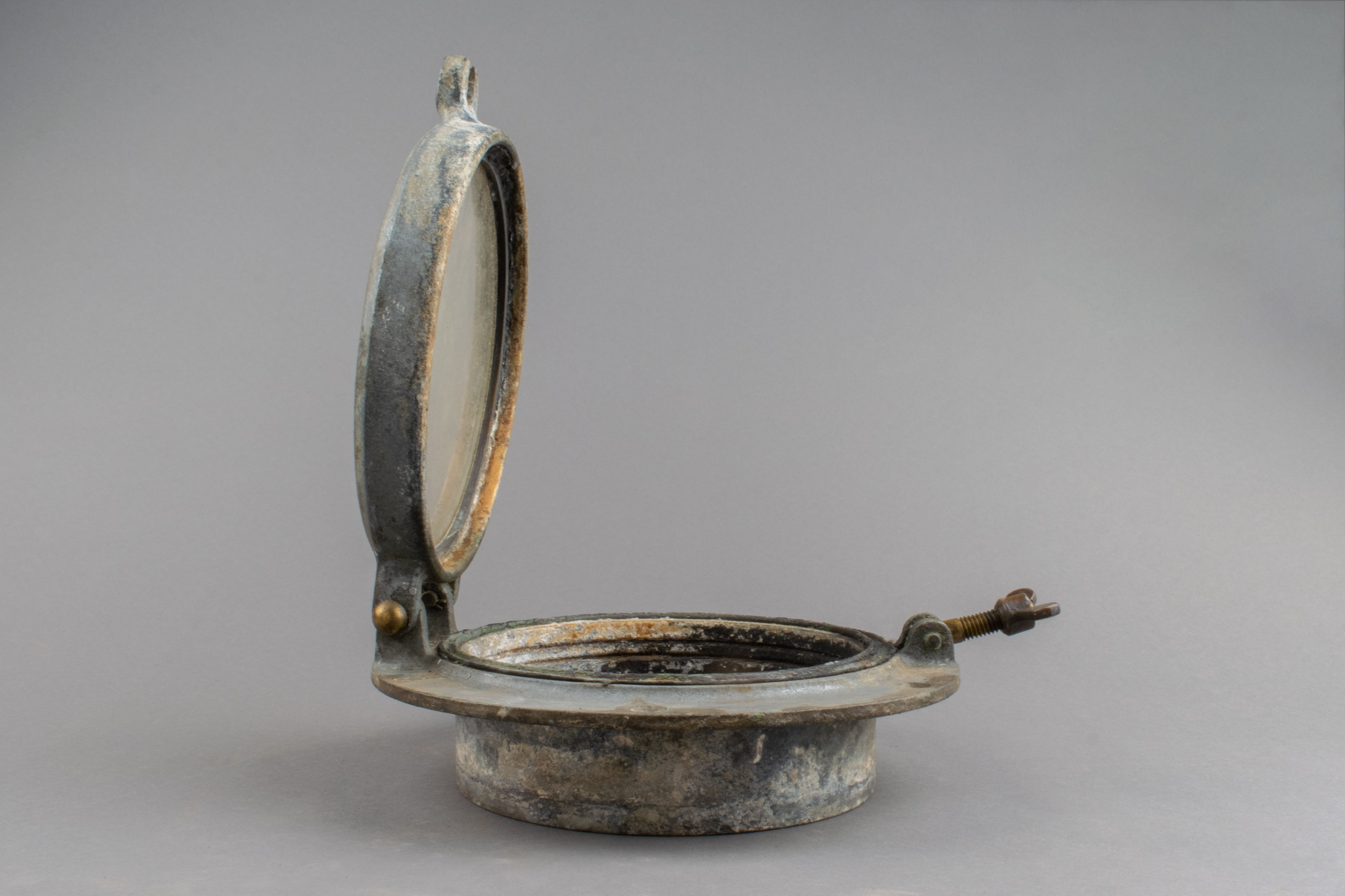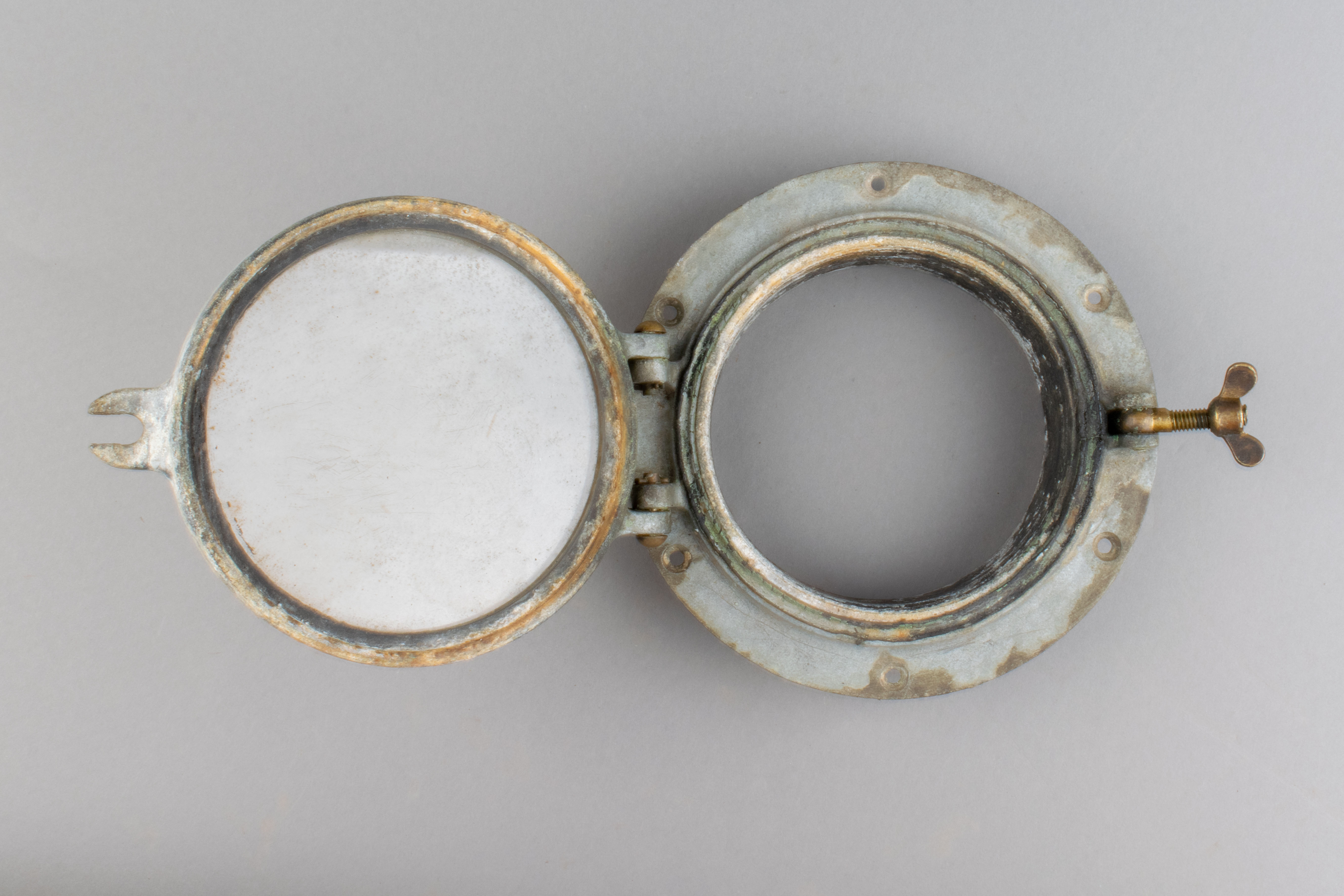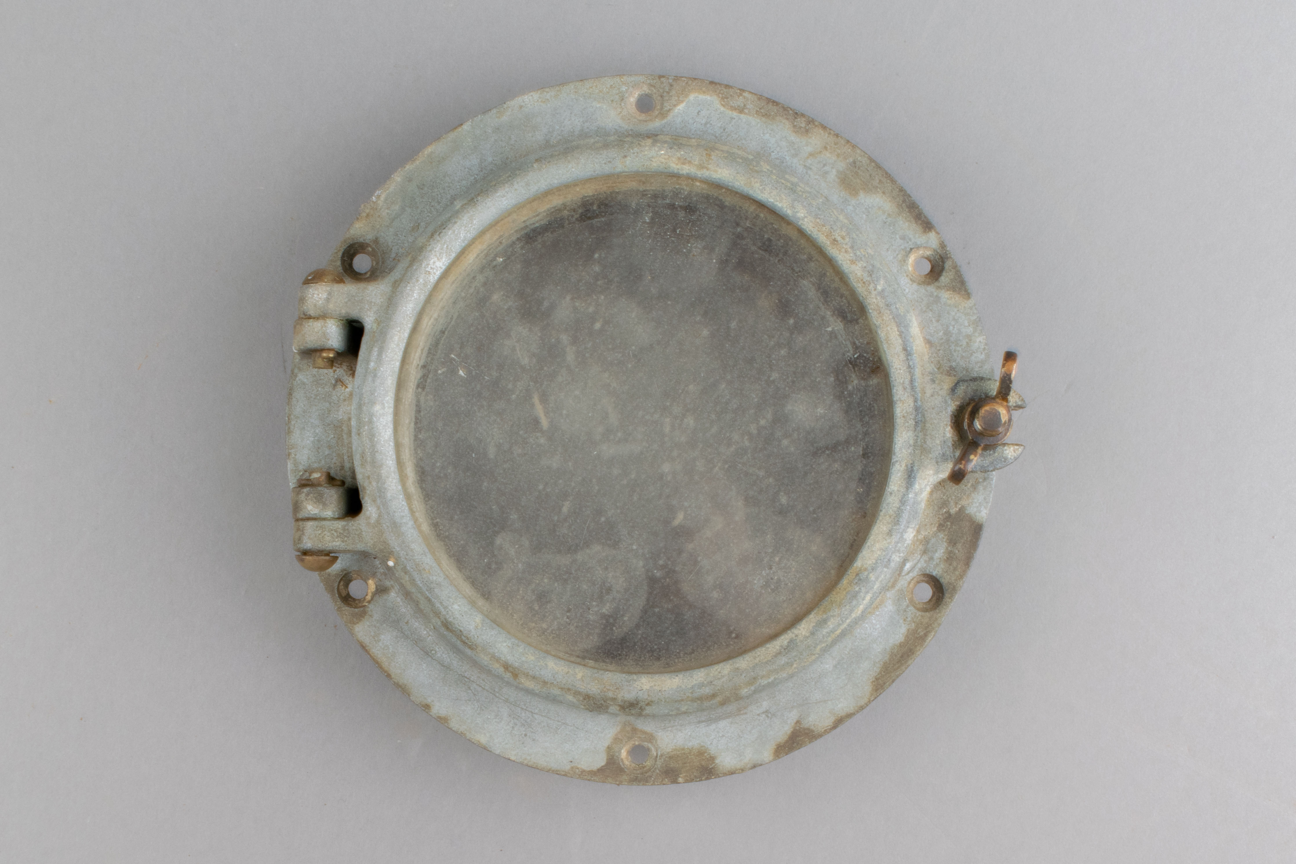 Le hublot est une pièce de navire mesurant 22 cm de diamètre. La monture en métal compte six trous et entoure un épais morceau de verre de forme circulaire. La monture comprend des écrous et une charnière.