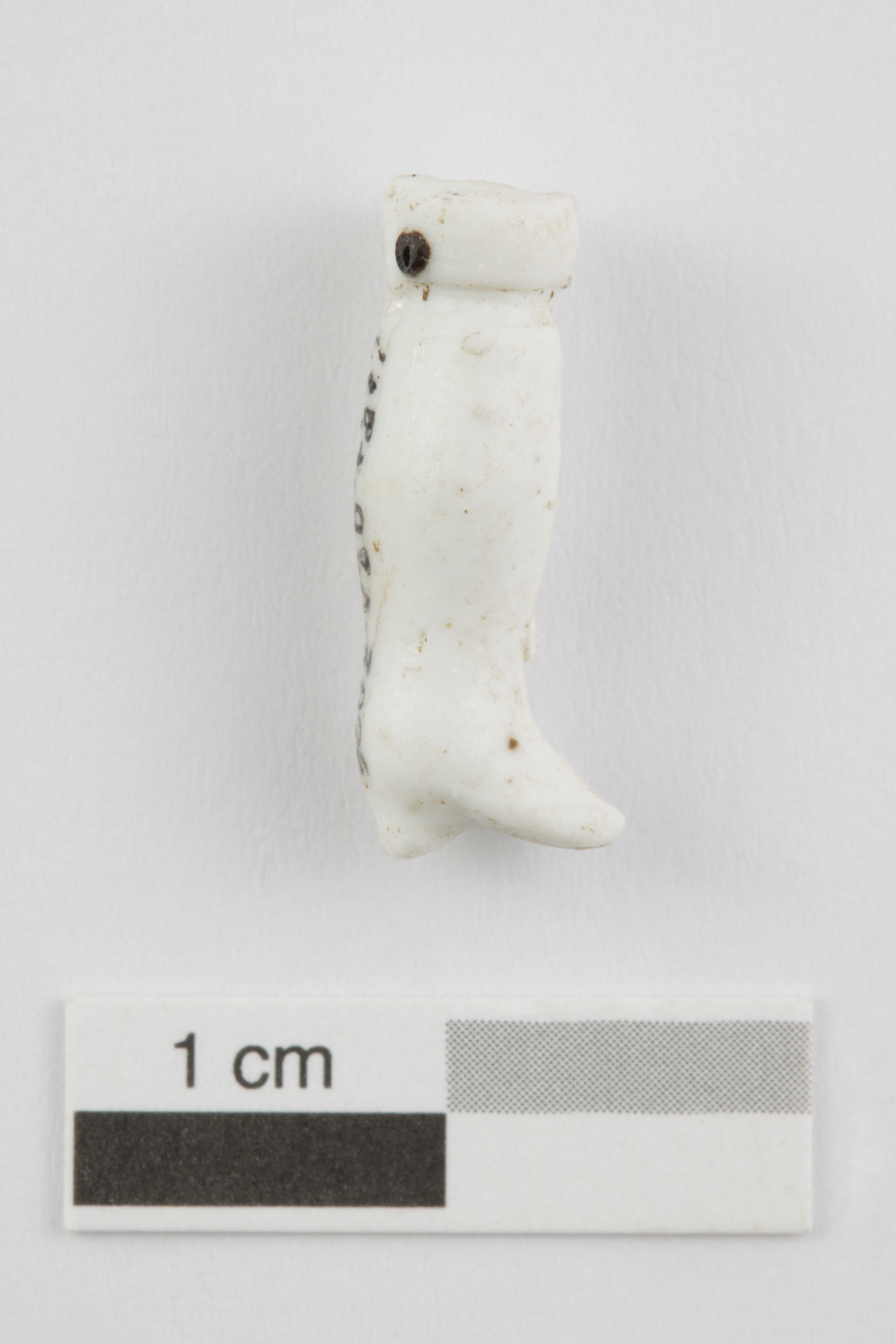 La jambe de poupée, dont la production se situe vers la fin du XIXe siècle, est un membre associé à une poupée. Cet objet est un jouet lié aux jeux d'enfants, généralement celui des petites filles. Entière, la jambe non glaçurée et non décorée représente une botte à talon. Faite de porcelaine fine et dure, la jambe mesure 1,8 cm de hauteur.