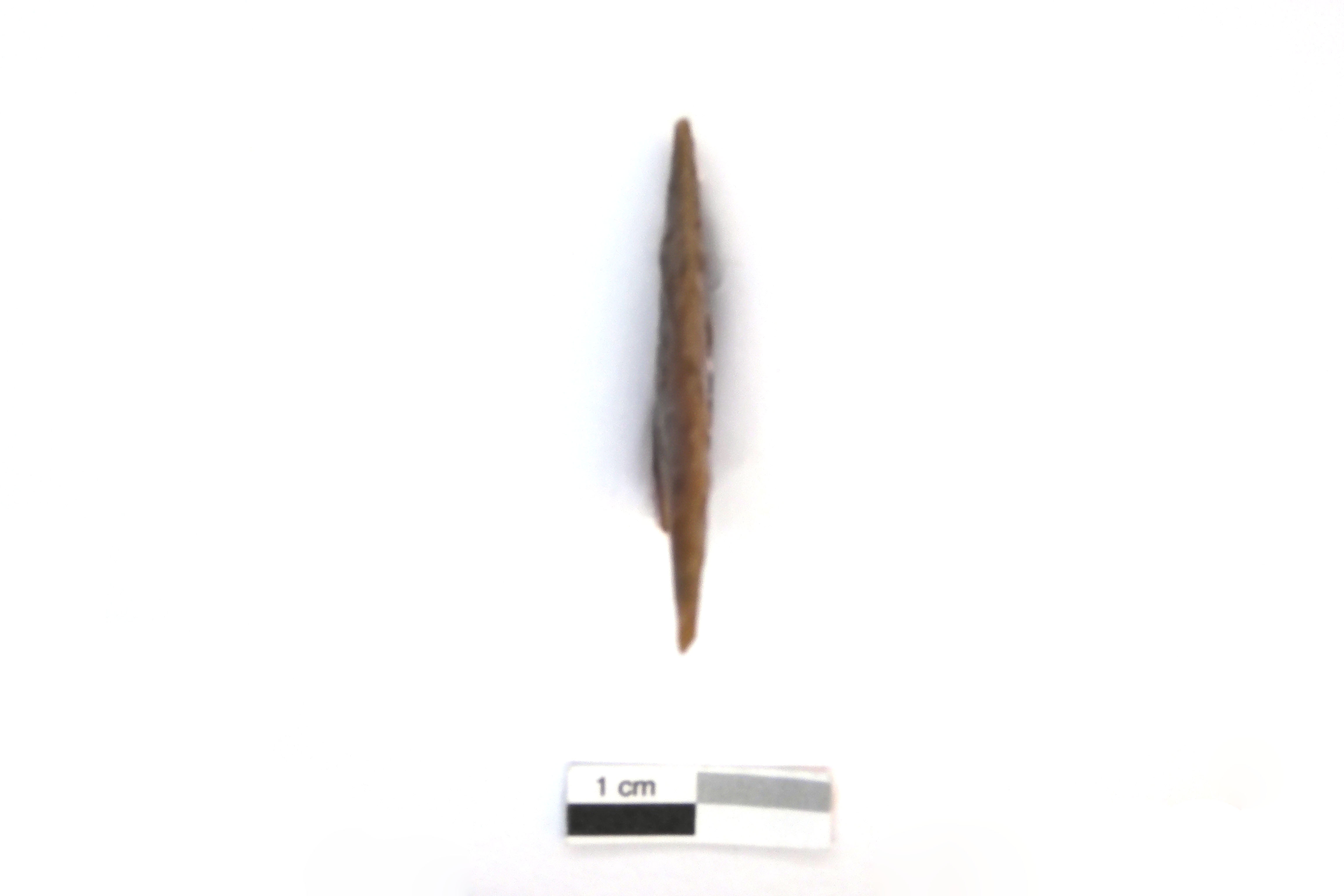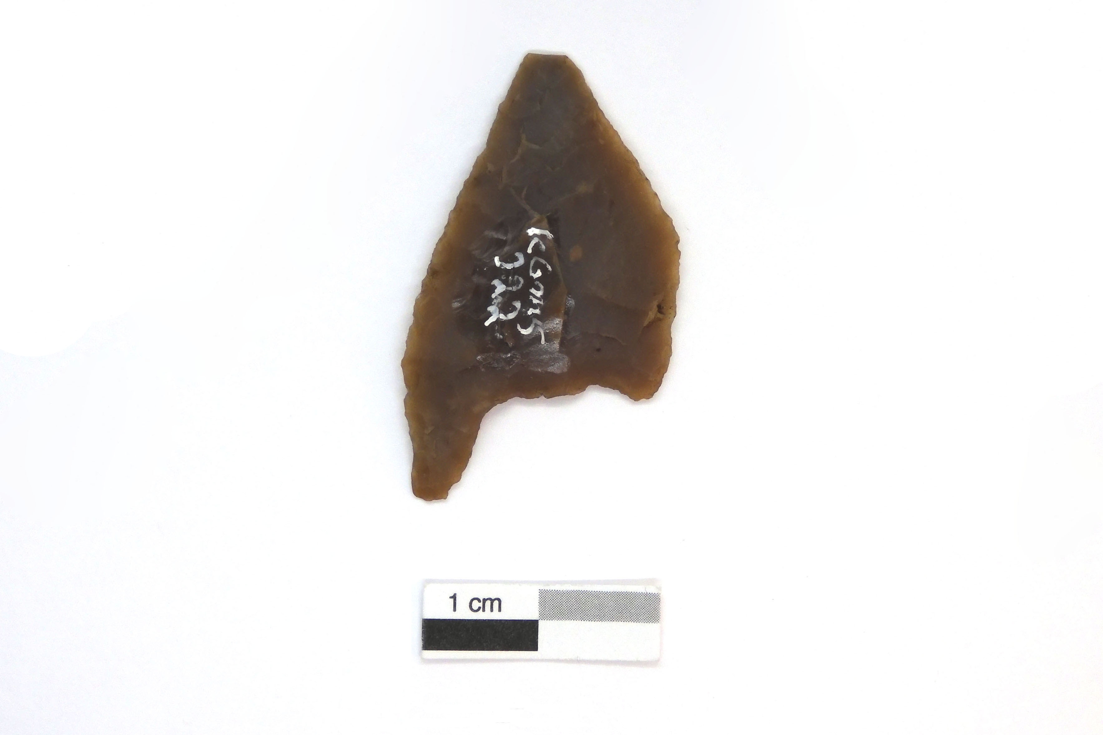 La pointe triangulaire à base concave, associée au Dorsétien classique (2 200 à 1 500 ans avant aujourd'hui), est une armature distale liée à la chasse. L'objet en chert présente une forme triangulaire et une base concave. Finement travaillée sur ses deux faces, la pointe a été réaménagée sur une partie de la base après la cassure de l'un des éperons. L'objet mesure 3,8 cm de longueur, 2,2 cm de largeur et présente une épaisseur de 0,4 cm.