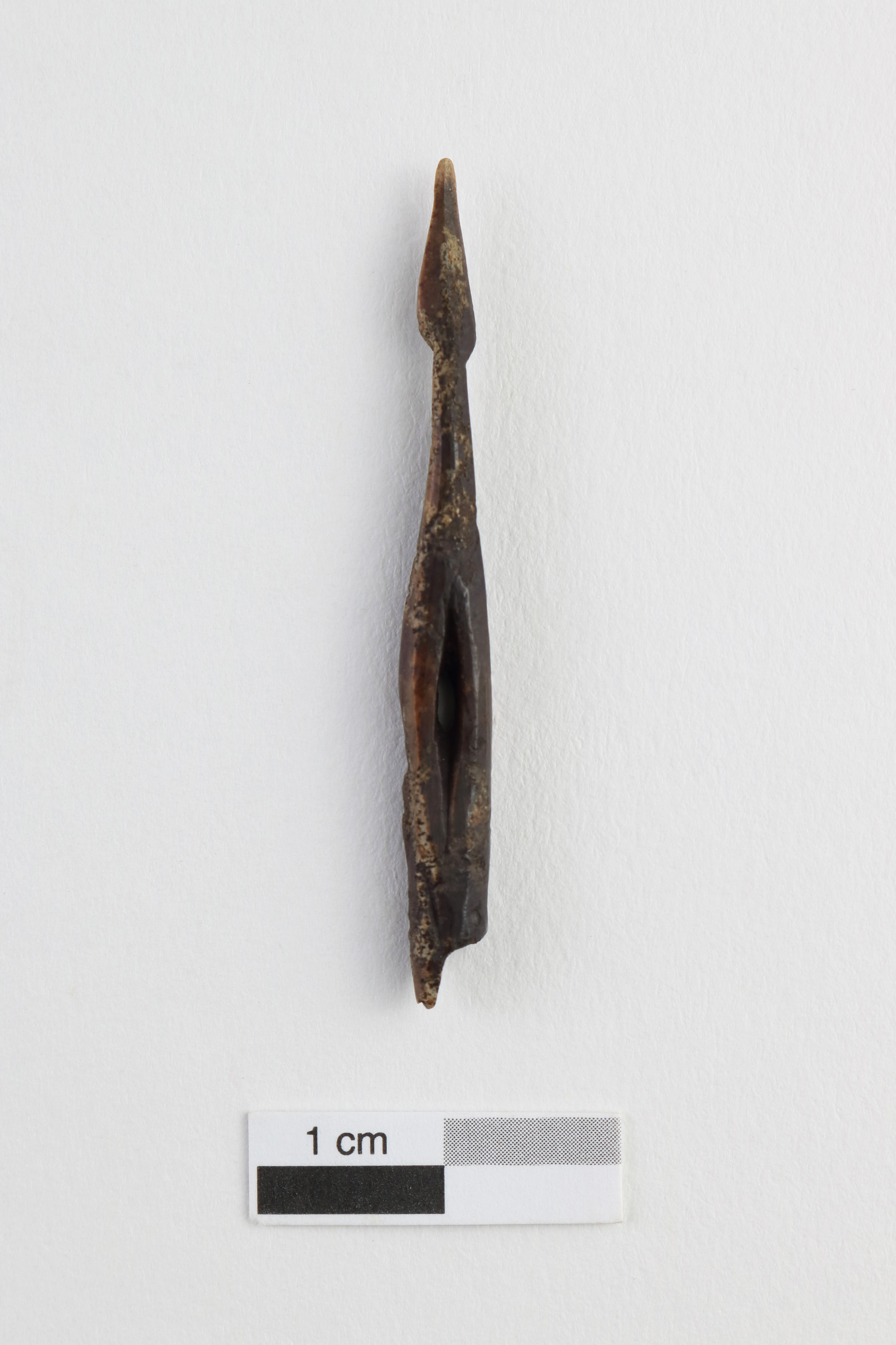 La pointe barbelée, associée au Dorsétien classique (2 200 à 1 500 ans avant aujourd'hui), est une pointe de projectile principalement utilisée pour la pêche et la chasse aux oiseaux. L'objet entier en ivoire de morse présente une double barbelure distale ainsi qu'une perforation dans la partie mésio-proximale. La pointe mesure 4,6 cm de longueur, 0,5 cm de largeur et a une épaisseur de 0,4 cm.